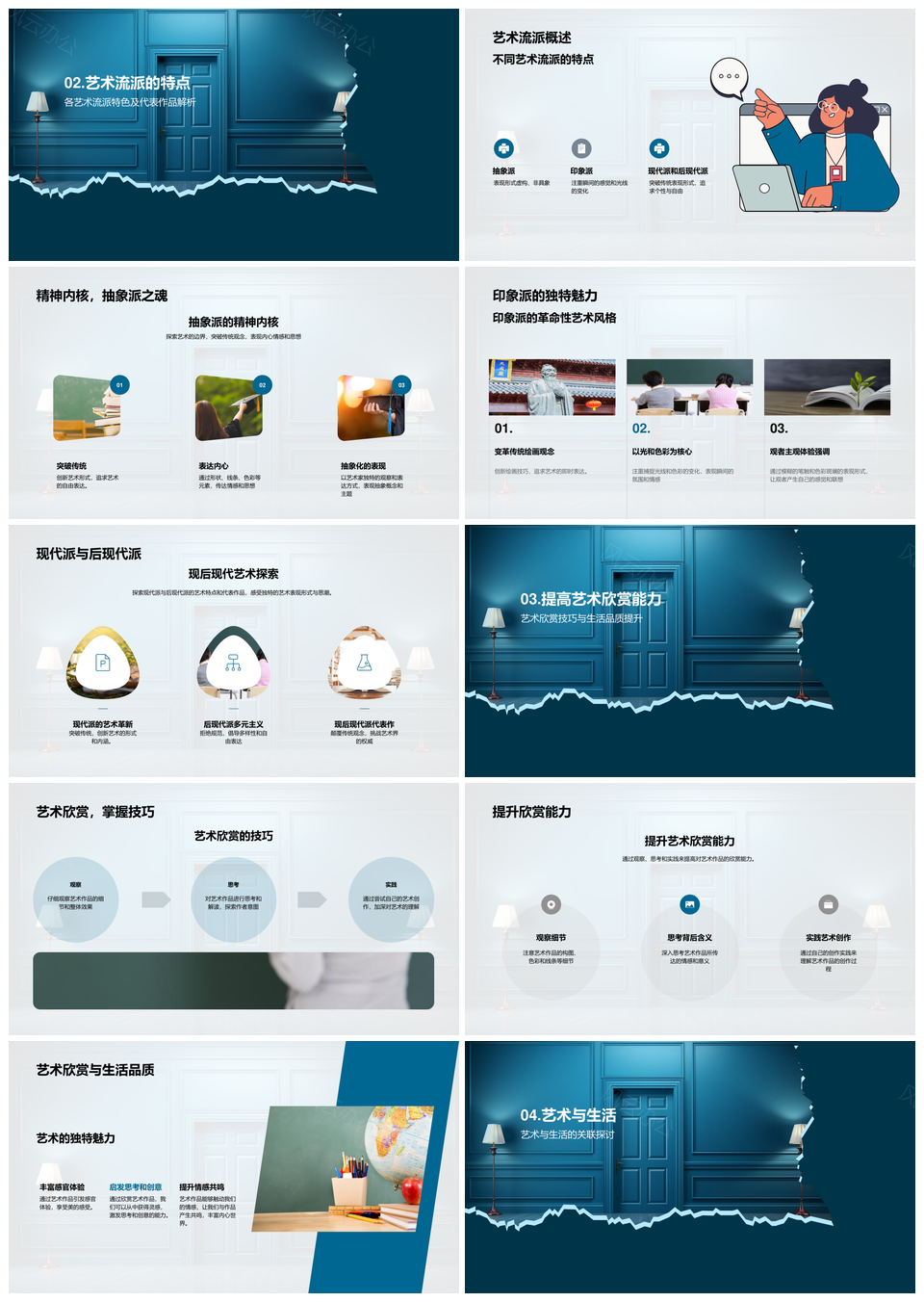 这是一张艺术之门抽象派印象派现代派与生活赏析PPT模板,包含艺术之门、抽象派、印象派、现代派、生活、赏析等主题内容,也可用作艺术之门抽象派印象派现代派、抽象派印象派现代派生活赏析、艺术之门抽象派印象派、艺术之门抽象派现代派、艺术之门抽象派生活赏析、艺术之门印象派现代派、艺术之门印象派生活赏析、艺术之门现代派生活赏析、抽象派印象派现代派、抽象派印象派生活赏析、抽象派现代派生活赏析、印象派现代派生活赏析、艺术之门抽象派、艺术之门印象派、艺术之门现代派等PPT场景使用。 风云办公提供的艺术之门抽象派印象派现代派与生活赏析PPT模板,下载格式为pptx,一共25页,作品中文字及图均可以修改和编辑,图片更改请在作品中右键图片并更换,文字修改请直接点击文字进行修改。