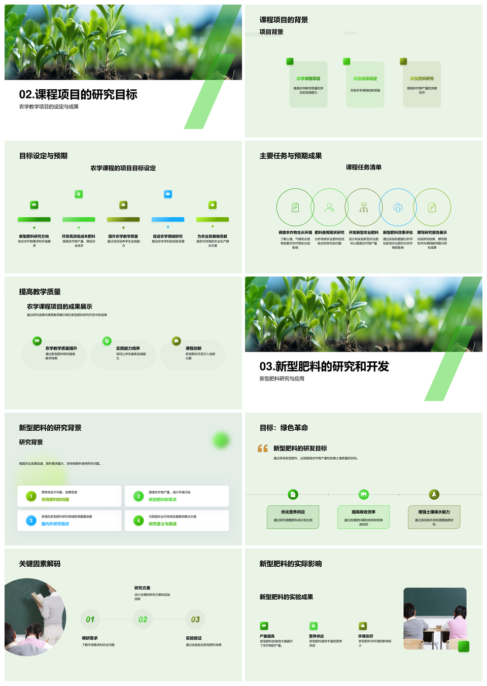 这是一张农学课程新肥研发教学提升增产农业工具PPT模板,包含农学课程、新肥、研发、教学、提升、增产、农业工具等主题内容,也可用作农学课程新肥研发、新肥研发教学提升、研发教学提升增产、教学提升增产农业、农学课程新肥、课程新肥研发、新肥研发教学、研发教学提升、教学提升增产、提升增产农业、农学课程、新肥研发、教学提升、农业工具、提升增产等PPT场景使用。 风云办公提供的农学课程新肥研发教学提升增产农业工具PPT模板,下载格式为pptx,一共27页,作品中文字及图均可以修改和编辑,图片更改请在作品中右键图片并更换,文字修改请直接点击文字进行修改。