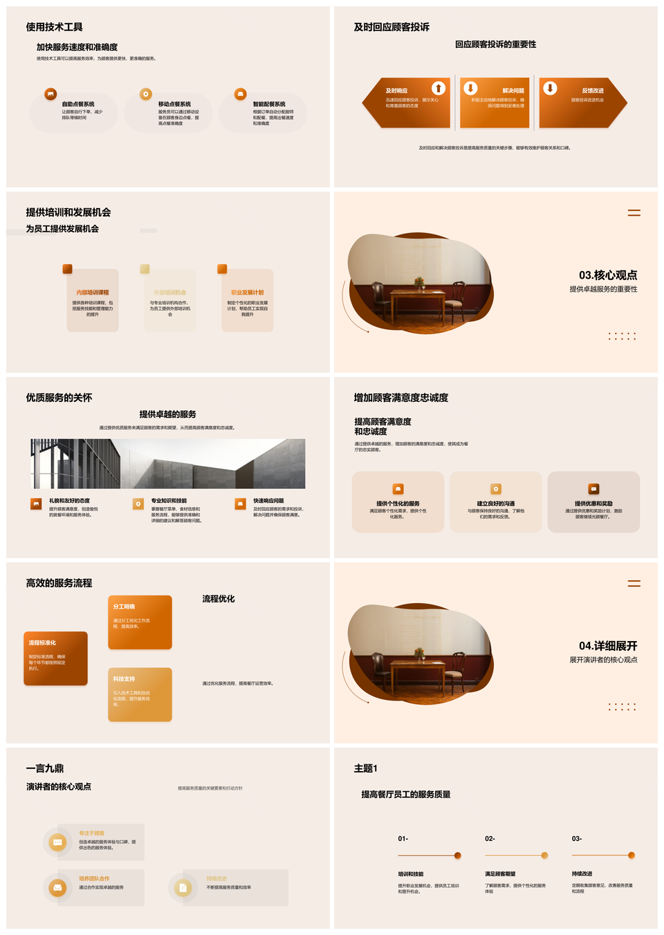 这是一张提升餐厅服务标准培训技能应用技术工具减投诉PPT模板,包含提升、餐厅、服务标准、培训、技能、应用、技术工具、减投诉等主题内容,也可用作提升餐厅服务标准培训技能应用、服务标准培训技能应用技术、培训技能应用技术工具、应用技术工具减投诉、提升服务标准培训技能、服务标准培训技术工具、培训技术工具减投诉、提升餐厅服务标准、餐厅服务标准培训、服务标准应用技术、技能应用技术工具、技术工具减投诉、提升培训技能、应用减投诉、服务标准工具等PPT场景使用。 风云办公提供的提升餐厅服务标准培训技能应用技术工具减投诉PPT模板,下载格式为pptx,一共23页,作品中文字及图均可以修改和编辑,图片更改请在作品中右键图片并更换,文字修改请直接点击文字进行修改。