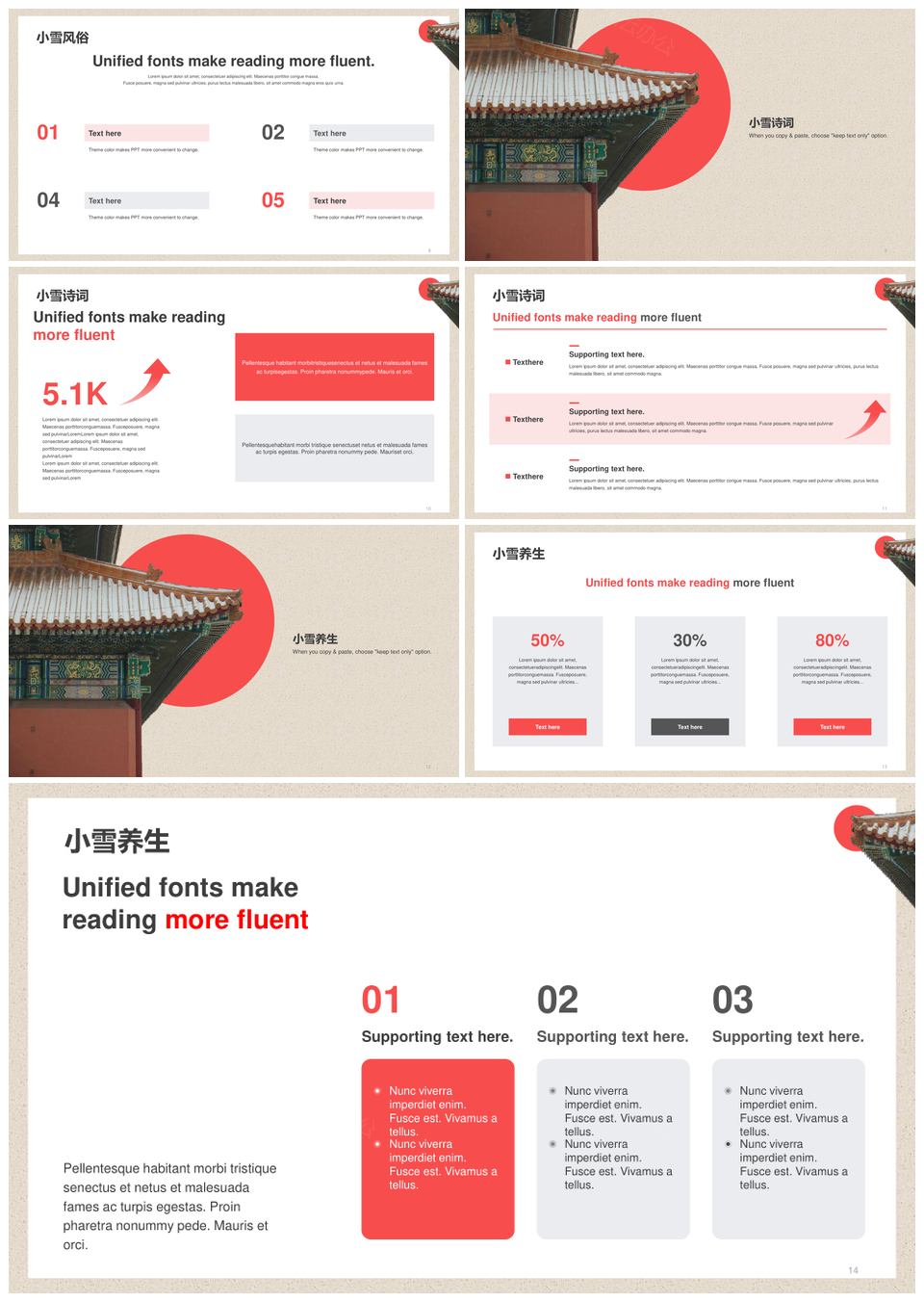 风云办公提供的故宫红国风复古小雪节气PPT模板,下载格式为pptx,一共15页,作品中文字及图均可以修改和编辑,图片更改请在作品中右键图片并更换,文字修改请直接点击文字进行修改。