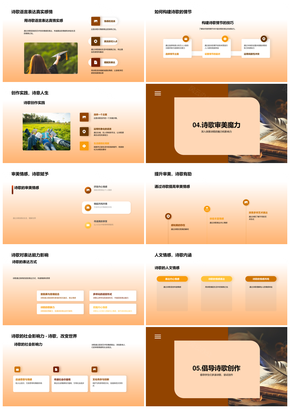 这是一张高中诗歌教学创作欣赏艺术表达探微PPT模板,包含高中、诗歌教学、创作、欣赏、艺术表达等主题内容,也可用作高中诗歌教学创作欣赏、诗歌教学创作欣赏艺术、教学创作欣赏艺术表达、创作欣赏艺术表达探微、高中诗歌教学创作、诗歌教学创作欣赏、教学创作欣赏艺术、创作欣赏艺术表达、欣赏艺术表达探微、高中诗歌教学、诗歌教学创作、教学创作欣赏、创作欣赏艺术、欣赏艺术表达、艺术表达探微等PPT场景使用。