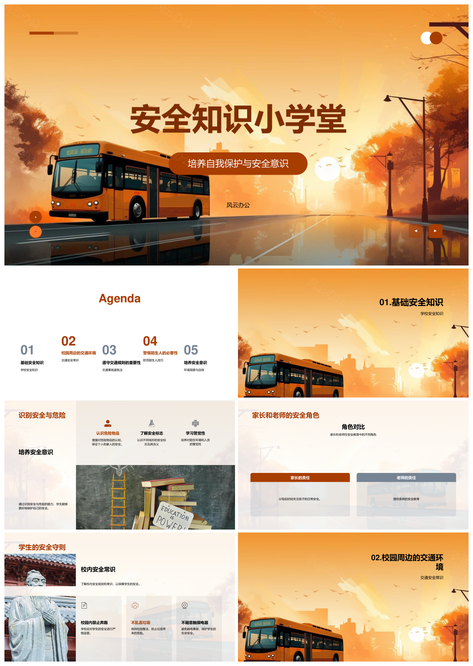风云办公提供的安全知识小学堂交通校车安全常识PPT模板,下载格式为pptx,一共23页,作品中文字及图均可以修改和编辑,图片更改请在作品中右键图片并更换,文字修改请直接点击文字进行修改。