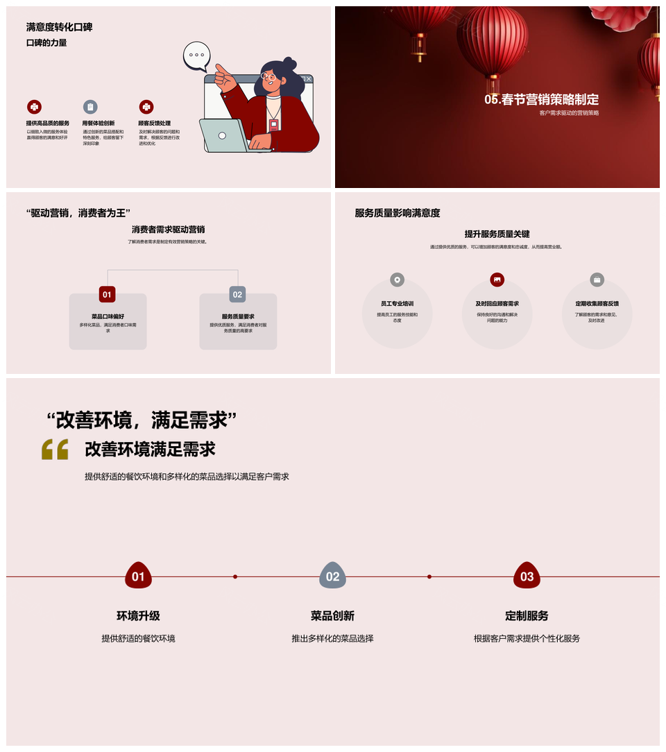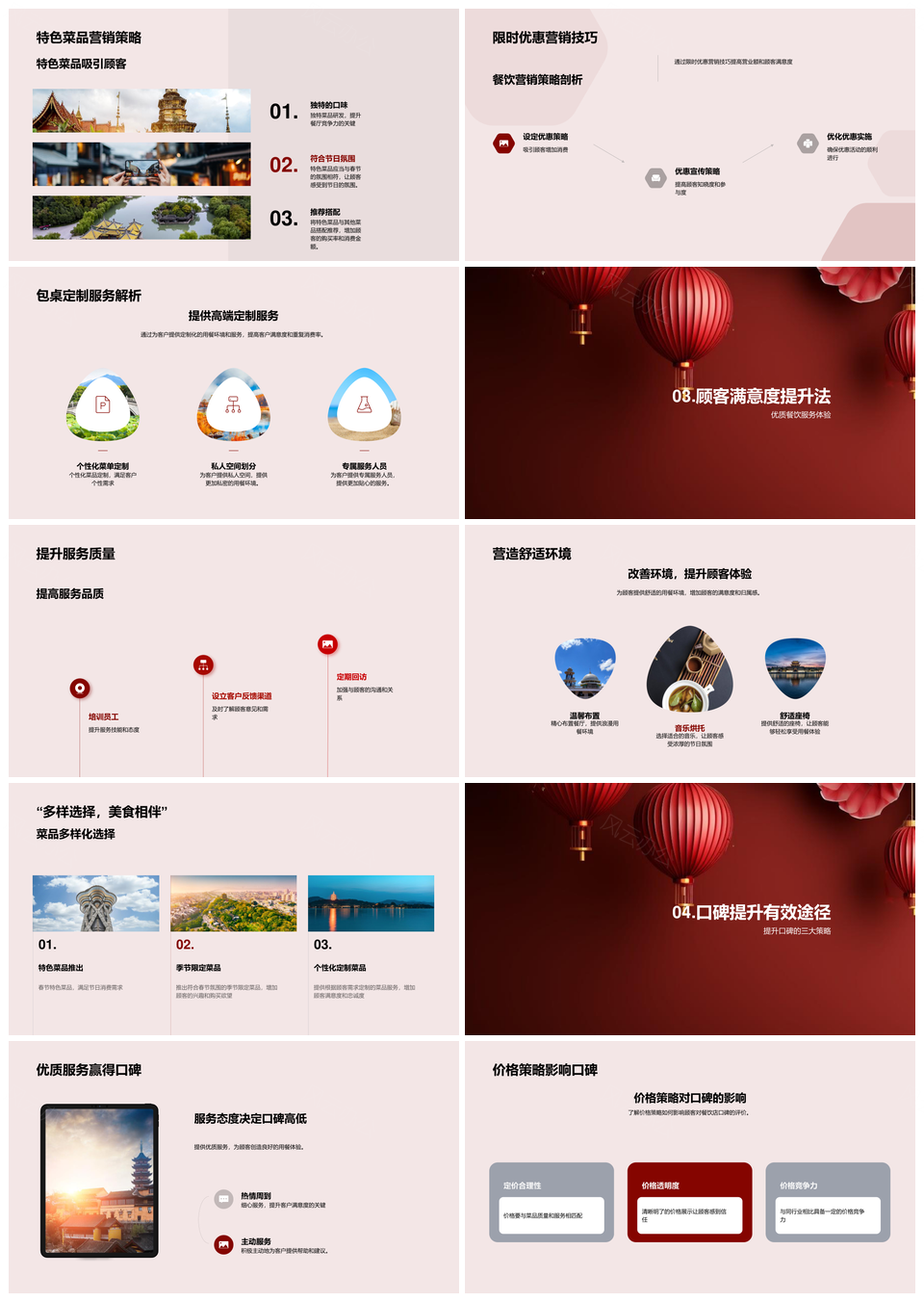 春节精准营销策略特色菜限时优惠包桌定制优服舒适环境灯笼PPT模板推荐