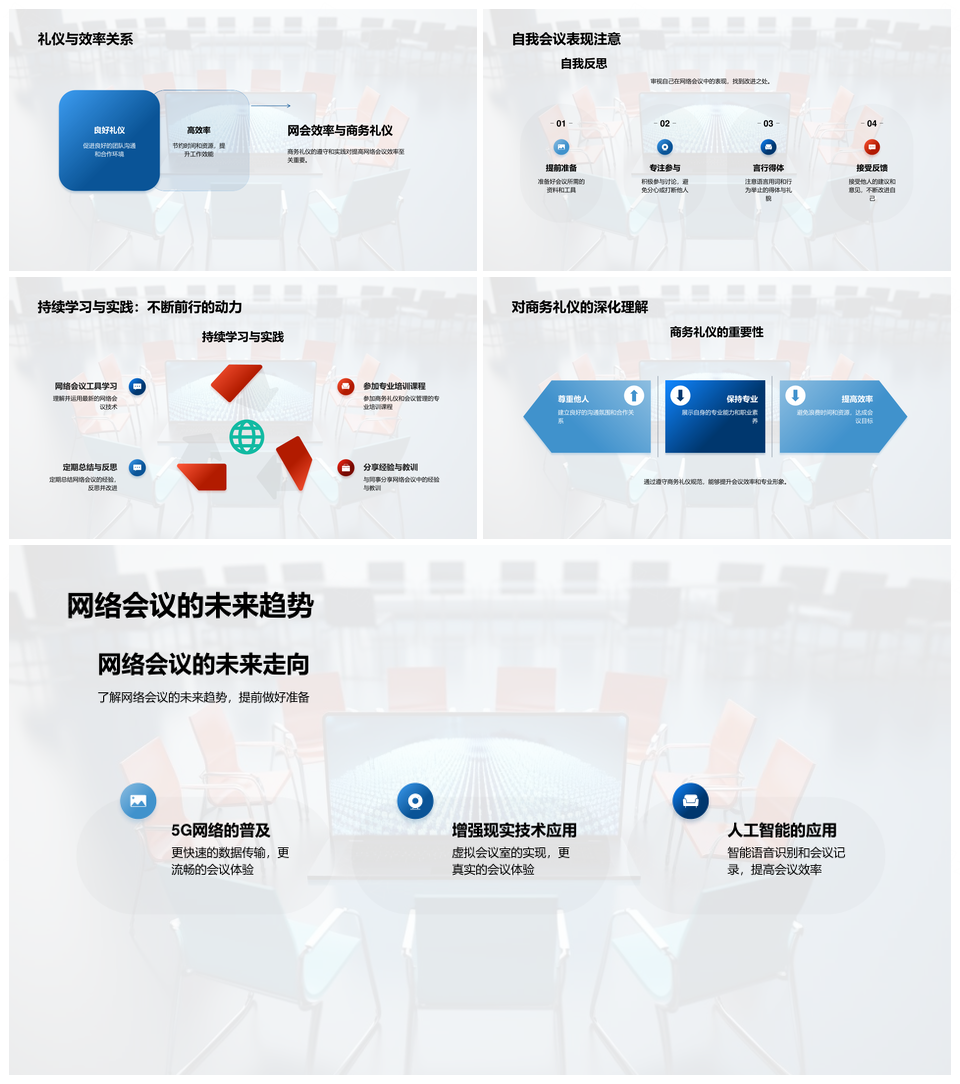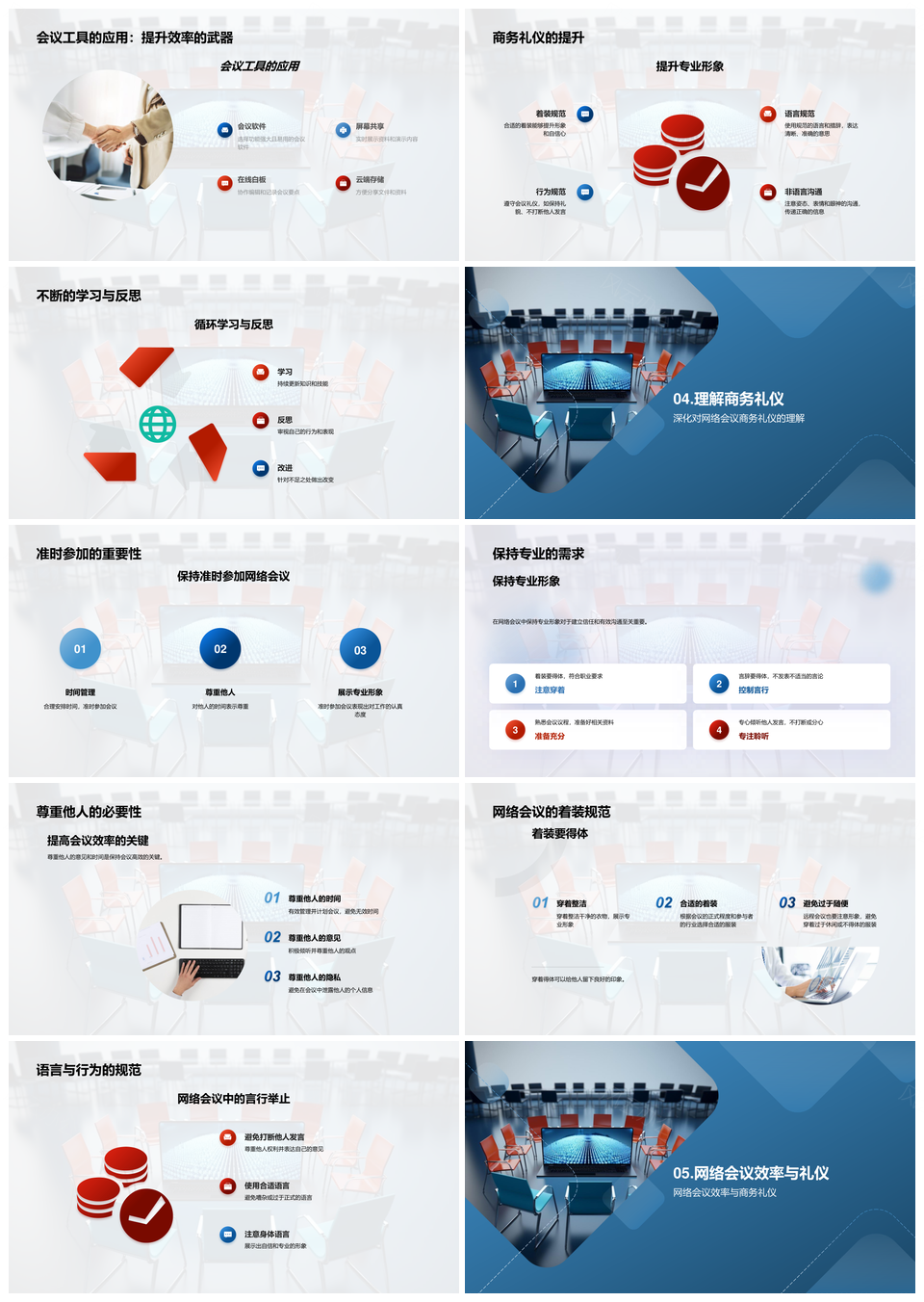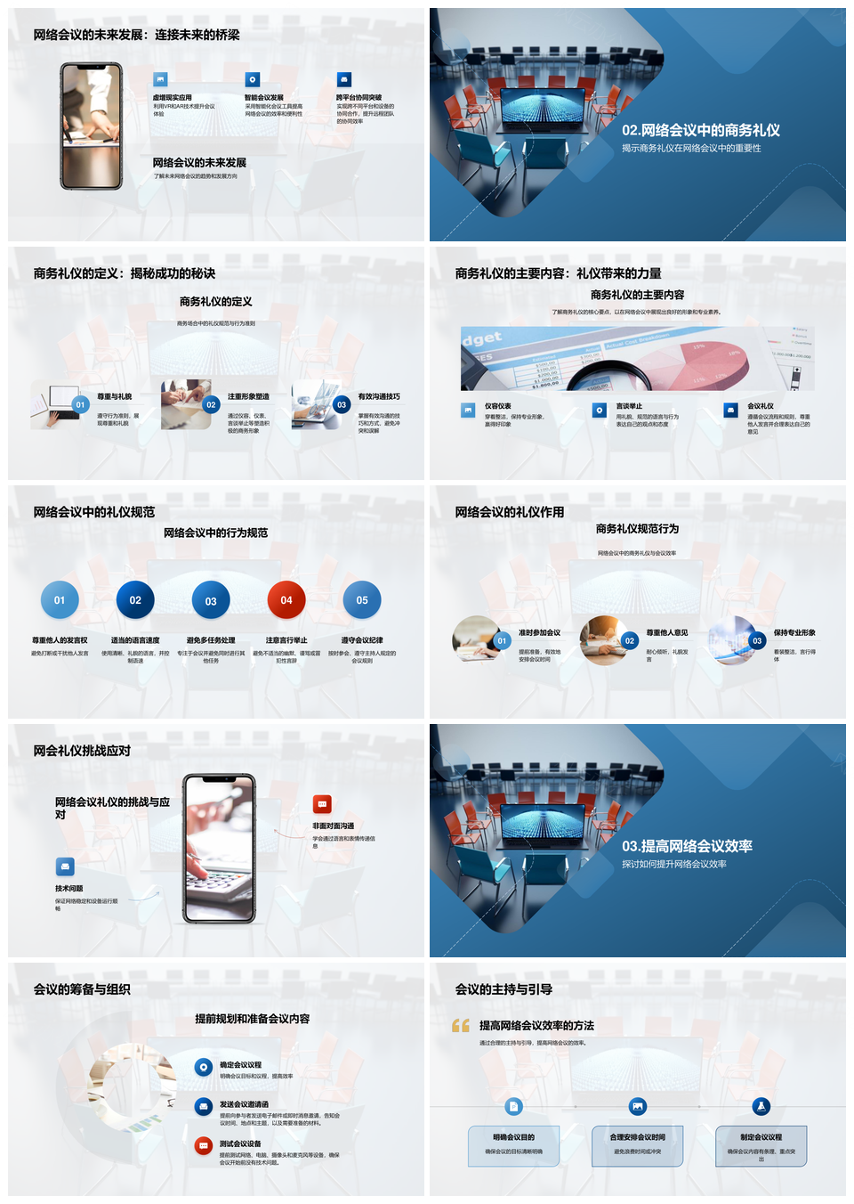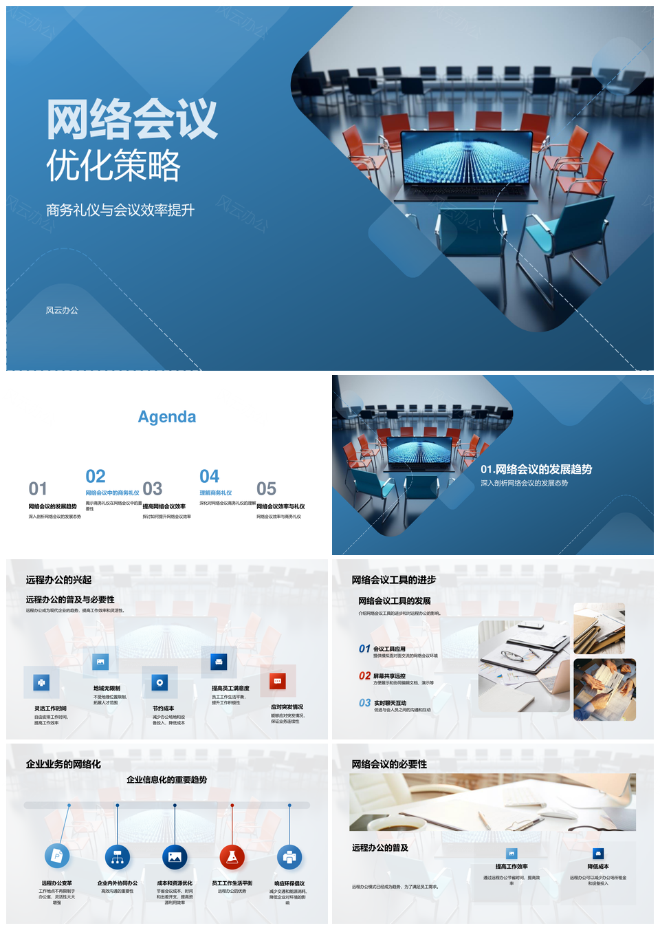 风云办公提供的网络会议高效管理工具应用与商务礼仪PPT模板,下载格式为pptx,一共33页,作品中文字及图均可以修改和编辑,图片更改请在作品中右键图片并更换,文字修改请直接点击文字进行修改。