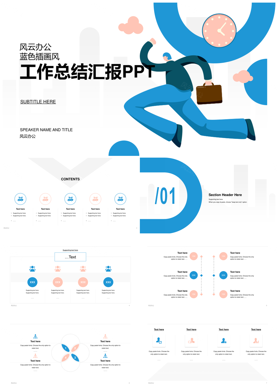 蓝色扁平插画办公总结计划时间人物PPT模板