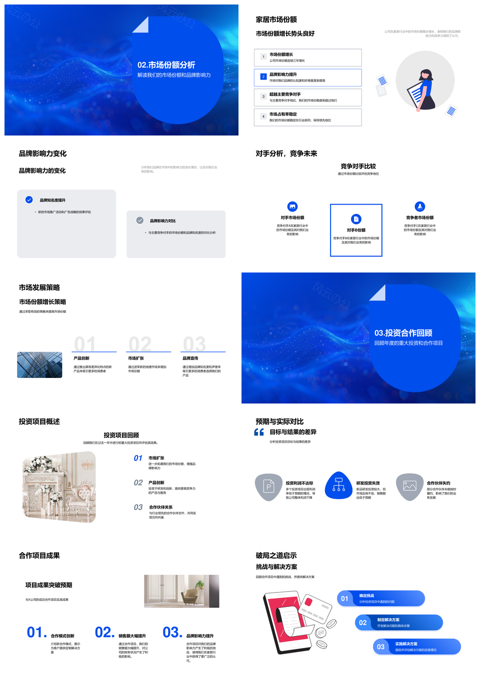 这是一张2025家居业年度盘点销售市场品牌战略合作投资PPT模板,包含2025、家居业、年度、盘点、销售市场、品牌、战略、合作、投资等主题内容,也可用作2025家居业年度盘点、家居业年度盘点销售市场、年度盘点销售市场品牌战略、销售市场品牌战略合作投资、2025家居业销售市场、家居业品牌战略合作、销售市场合作投资、品牌战略合作投资、年度盘点品牌战略、家居业年度合作投资、2025家居业、年度盘点、销售市场、品牌战略、合作投资等PPT场景使用。 风云办公提供的2025家居业年度盘点销售市场品牌战略合作投资PPT模板,下载格式为pptx,一共28页,作品中文字及图均可以修改和编辑,图片更改请在作品中右键图片并更换,文字修改请直接点击文字进行修改。