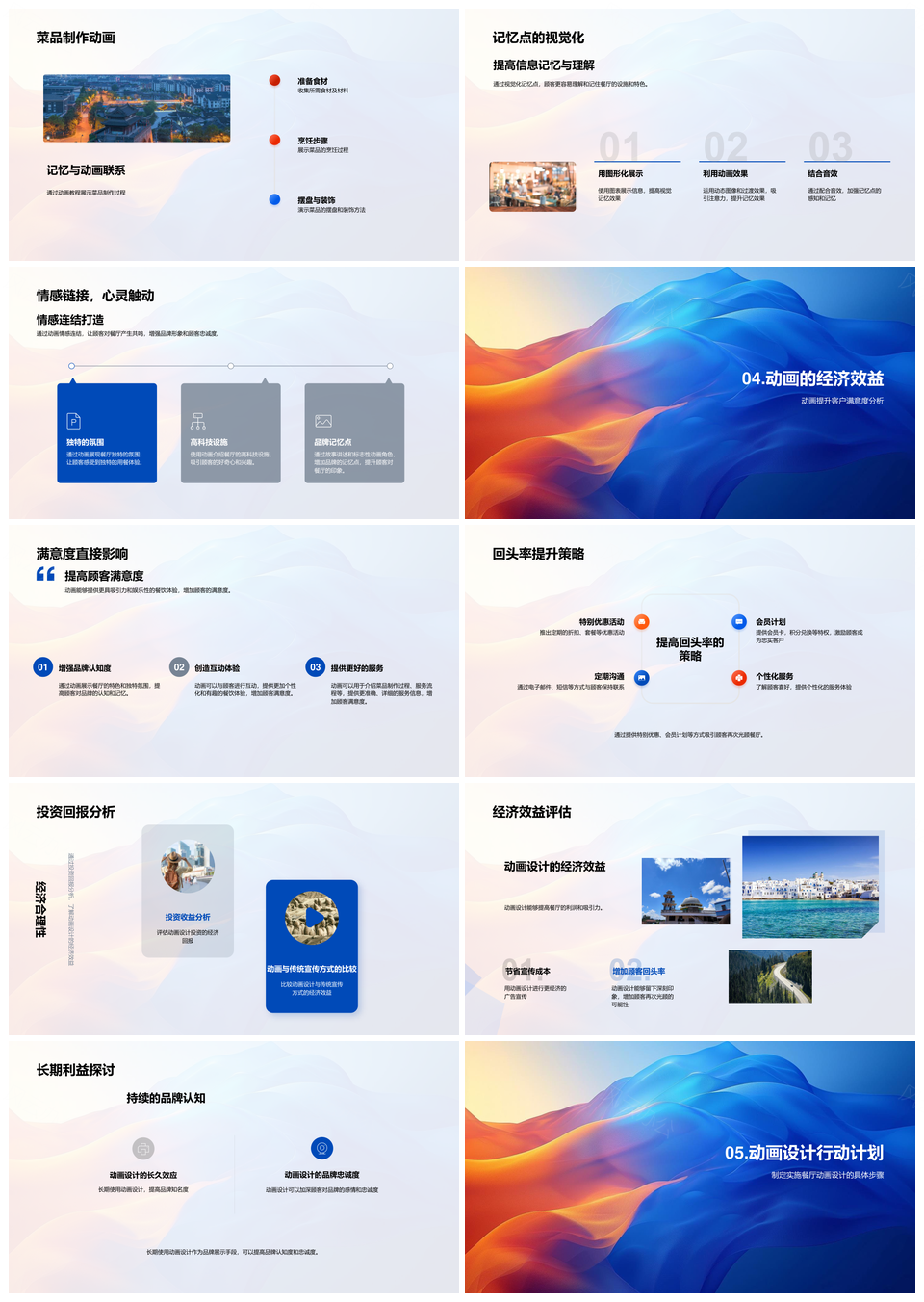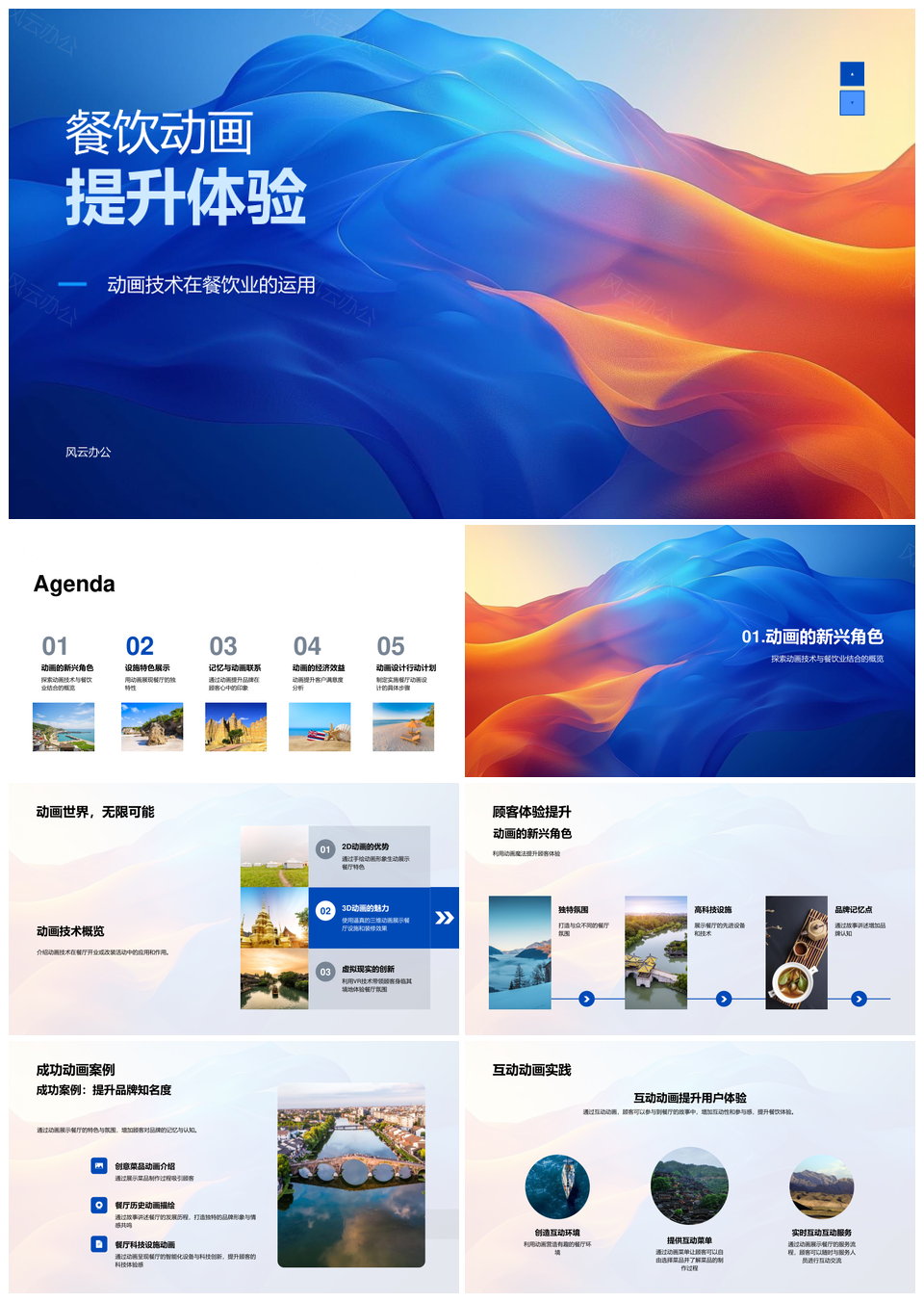 风云办公提供的餐饮动画技术提升品牌体验记忆度PPT模板,下载格式为pptx,一共33页,作品中文字及图均可以修改和编辑,图片更改请在作品中右键图片并更换,文字修改请直接点击文字进行修改。