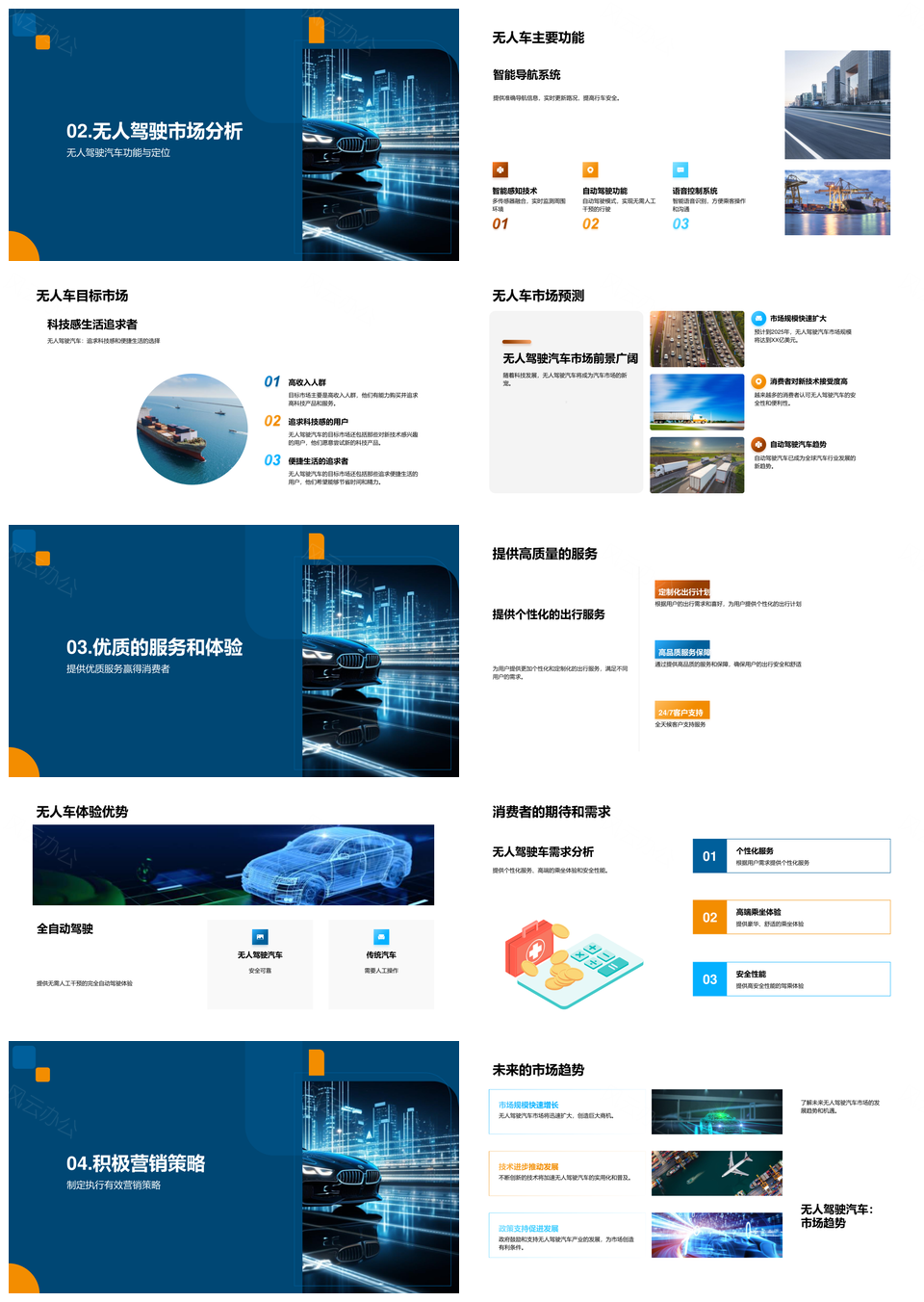 这是一张无人驾驶汽车高端科技人群全自动驾驶营销策略PPT模板,包含无人驾驶汽车、高端科技人群、全自动驾驶、营销策略等主题内容,也可用作无人驾驶汽车高端科技人群全自动驾驶、高端科技人群全自动驾驶营销策略、无人驾驶汽车高端科技全自动驾驶营销策略、无人驾驶汽车高端科技人群营销策略、高端科技全自动驾驶营销策略、无人驾驶汽车全自动驾驶营销策略、高端科技人群全自动驾驶、人群全自动驾驶营销策略、无人驾驶汽车高端科技全自动驾驶、无人驾驶汽车高端科技营销策略、无人驾驶汽车人群全自动驾驶、高端科技人群营销策略、无人驾驶汽车全自动驾驶、全自动驾驶营销策略、高端科技营销策略等PPT场景使用。 风云办公提供的无人驾驶汽车高端科技人群全自动驾驶营销策略PPT模板,下载格式为pptx,一共24页,作品中文字及图均可以修改和编辑,图片更改请在作品中右键图片并更换,文字修改请直接点击文字进行修改。