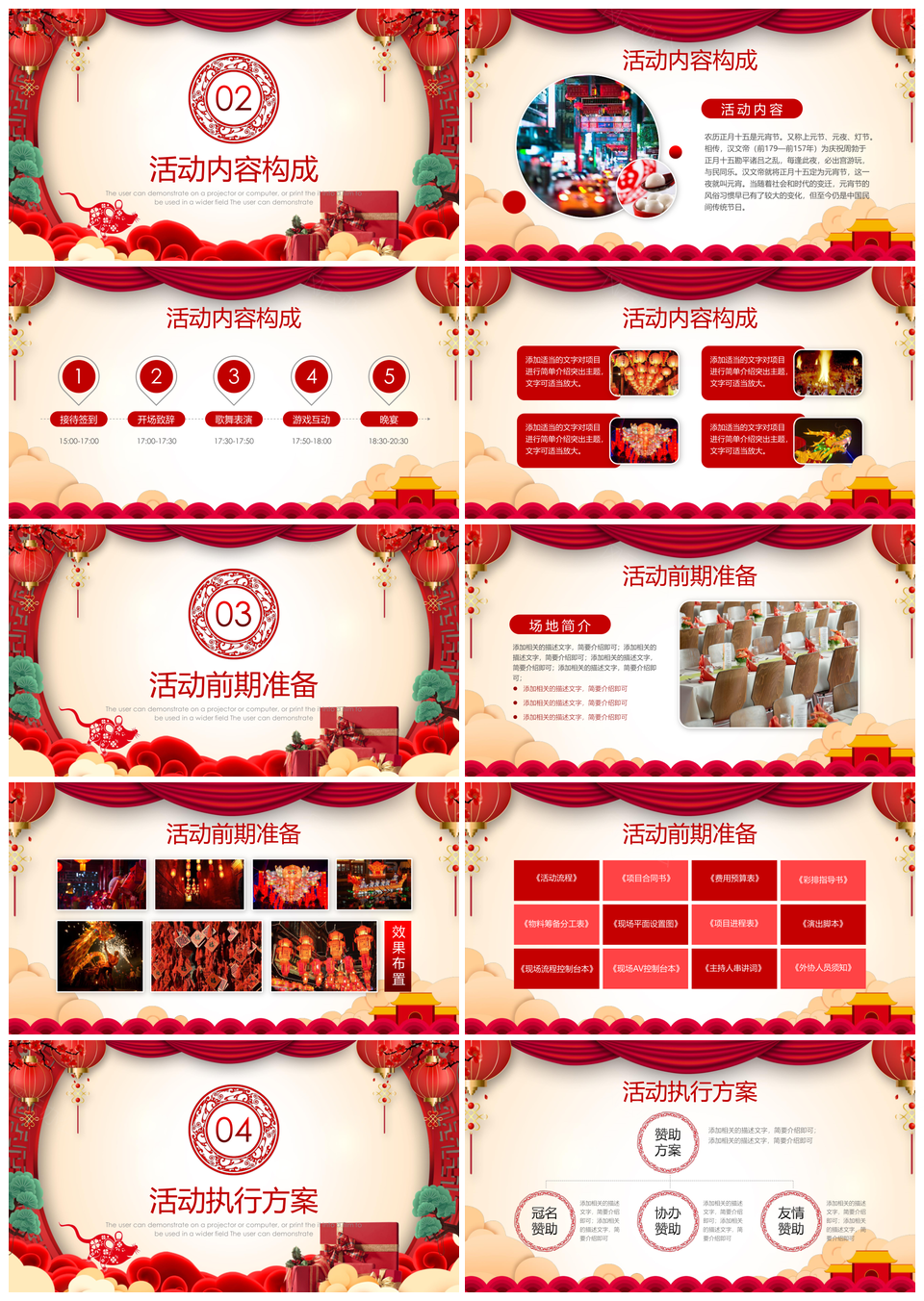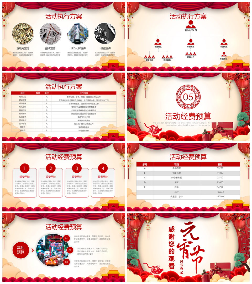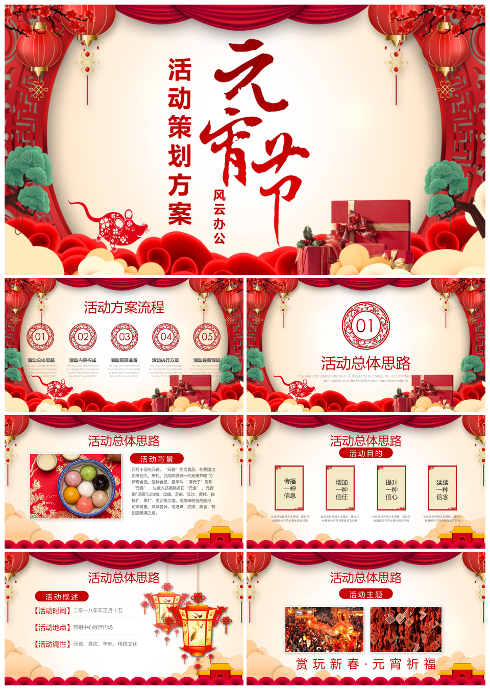 风云办公提供的红色喜庆元宵节活动策划方案PPT模板,下载格式为pptx,一共25页,作品中文字及图均可以修改和编辑,图片更改请在作品中右键图片并更换,文字修改请直接点击文字进行修改。