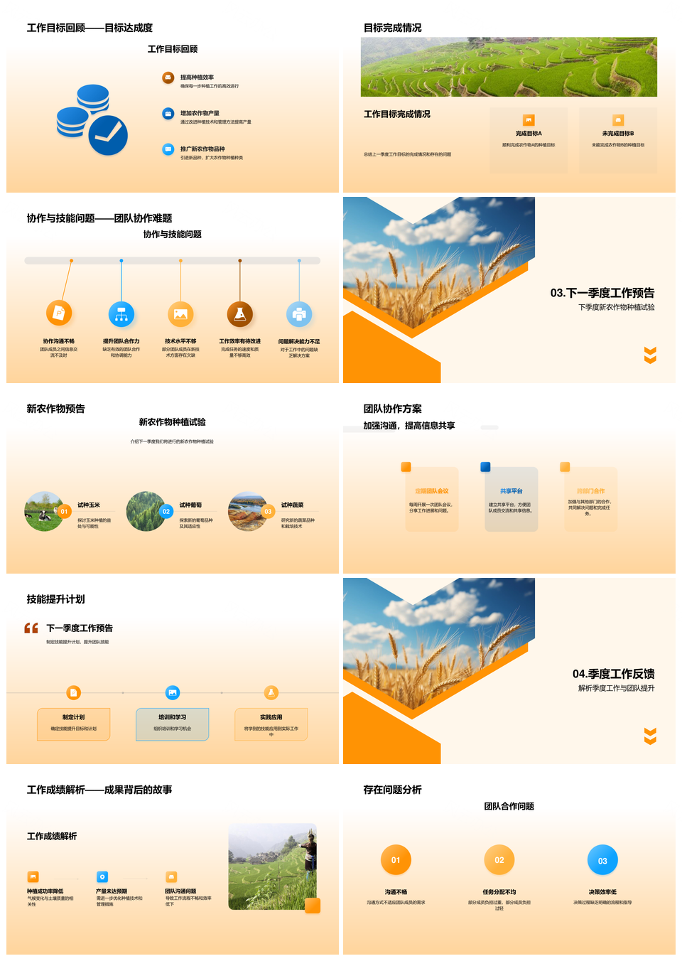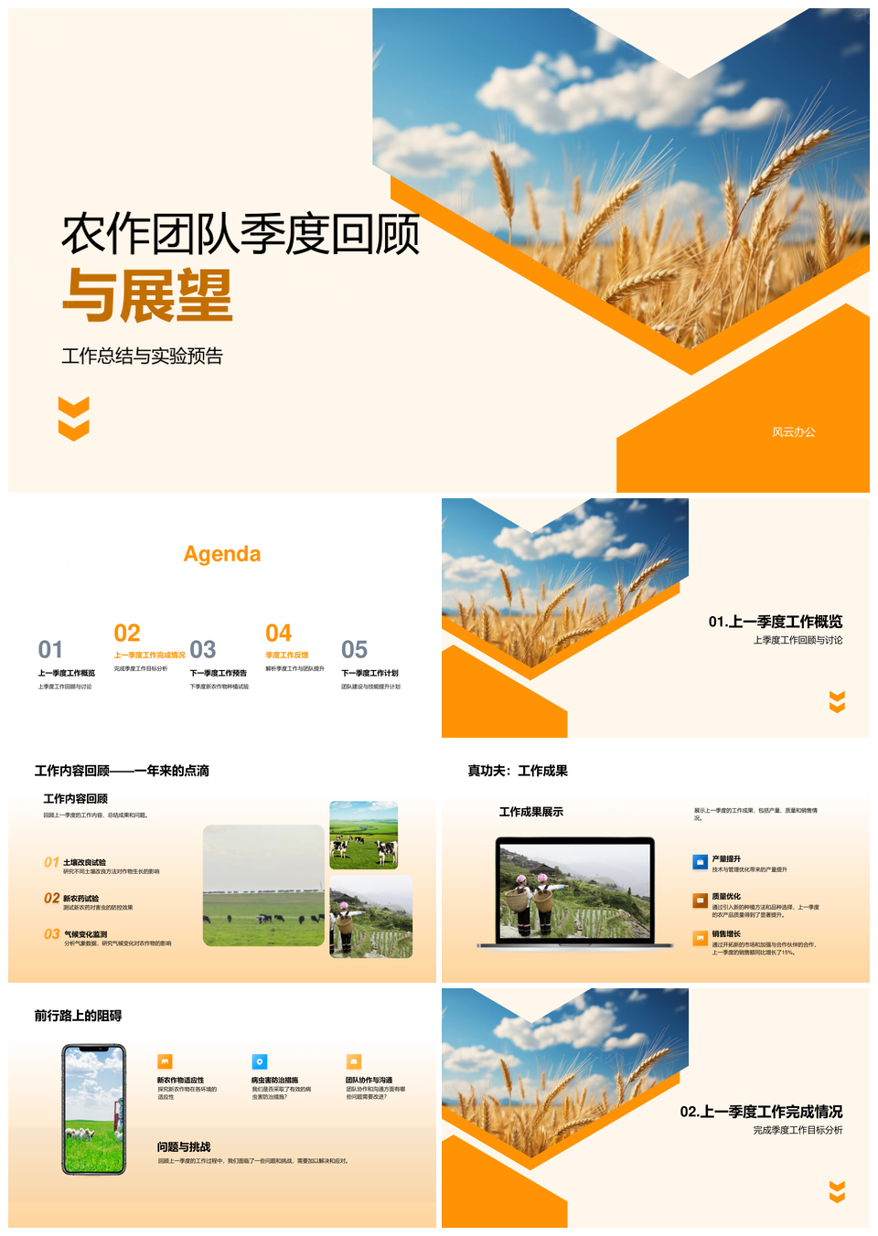 风云办公提供的农作团队季度总结协作展望麦田实验PPT模板,下载格式为pptx,一共24页,作品中文字及图均可以修改和编辑,图片更改请在作品中右键图片并更换,文字修改请直接点击文字进行修改。