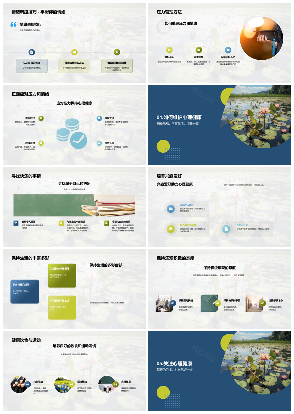 风云办公提供的健康心灵压力管理与情绪调控指南PPT模板,下载格式为pptx,一共33页,作品中文字及图均可以修改和编辑,图片更改请在作品中右键图片并更换,文字修改请直接点击文字进行修改。