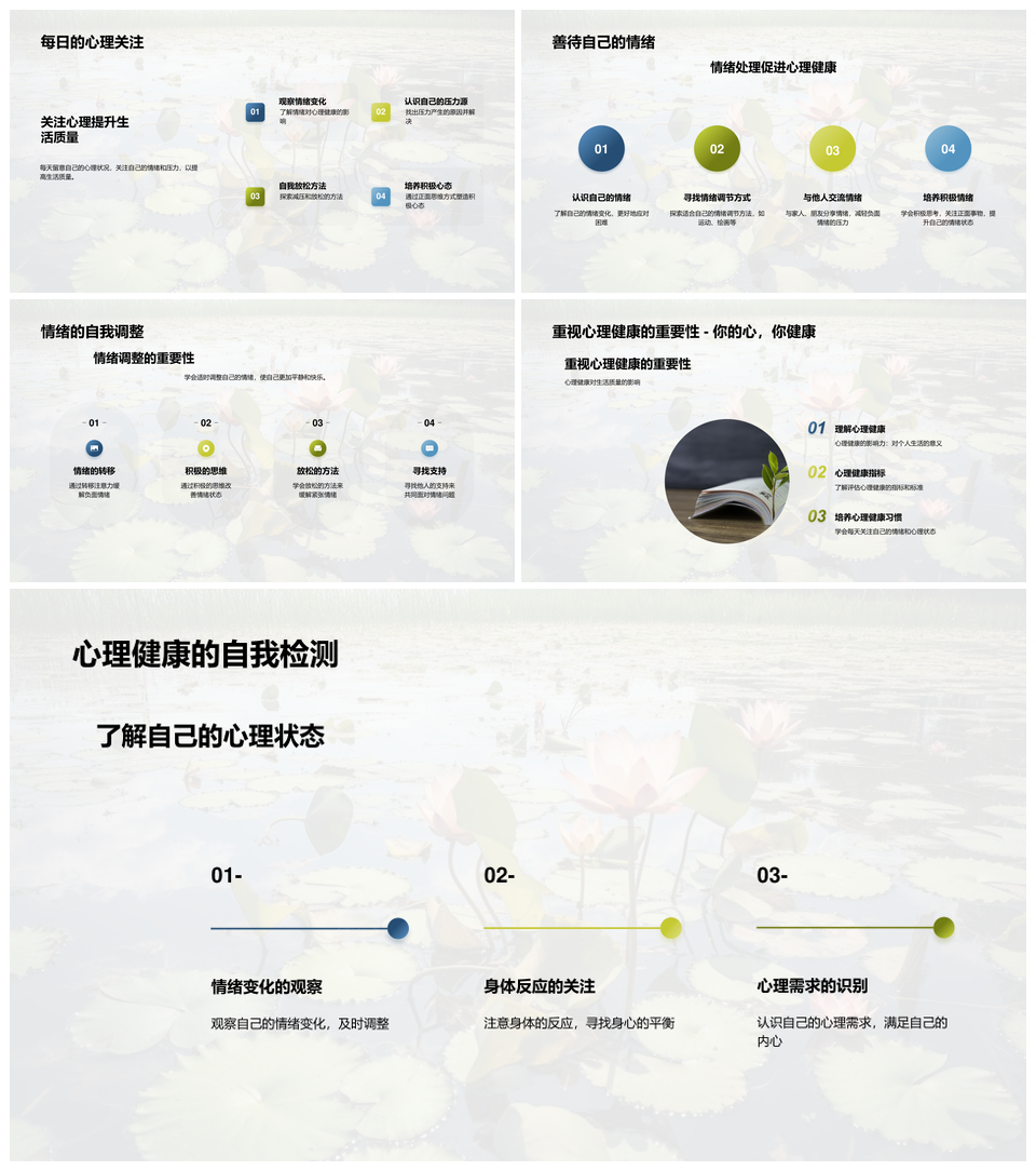 这是一张健康心灵压力管理与情绪调控指南PPT模板,包含健康、心灵、压力、管理、情绪、调控、指南等主题内容,也可用作健康心灵压力管理指南、健康心灵情绪调控指南、健康心灵压力管理情绪调控、健康压力管理情绪调控指南、心灵压力管理情绪调控指南、健康心灵压力管理、健康心灵情绪调控、压力管理情绪调控指南、健康压力管理指南、健康情绪调控指南、心灵压力管理情绪调控、心灵压力管理指南、心灵情绪调控指南、健康心灵指南、健康心灵等PPT场景使用。