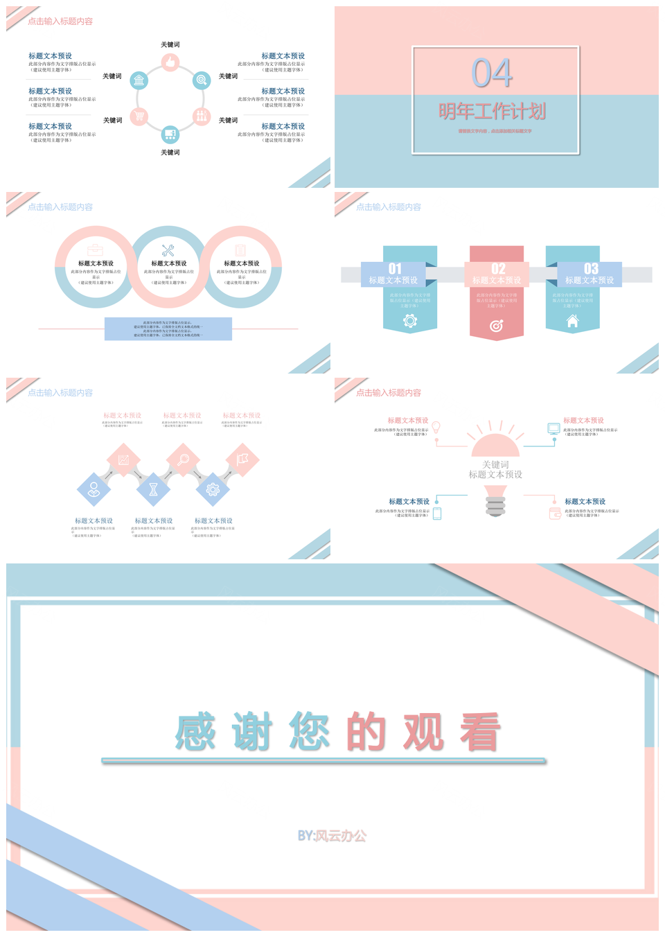 风云办公提供的小清新撞色工作计划总结PPT模板,下载格式为pptx,一共24页,作品中文字及图均可以修改和编辑,图片更改请在作品中右键图片并更换,文字修改请直接点击文字进行修改。