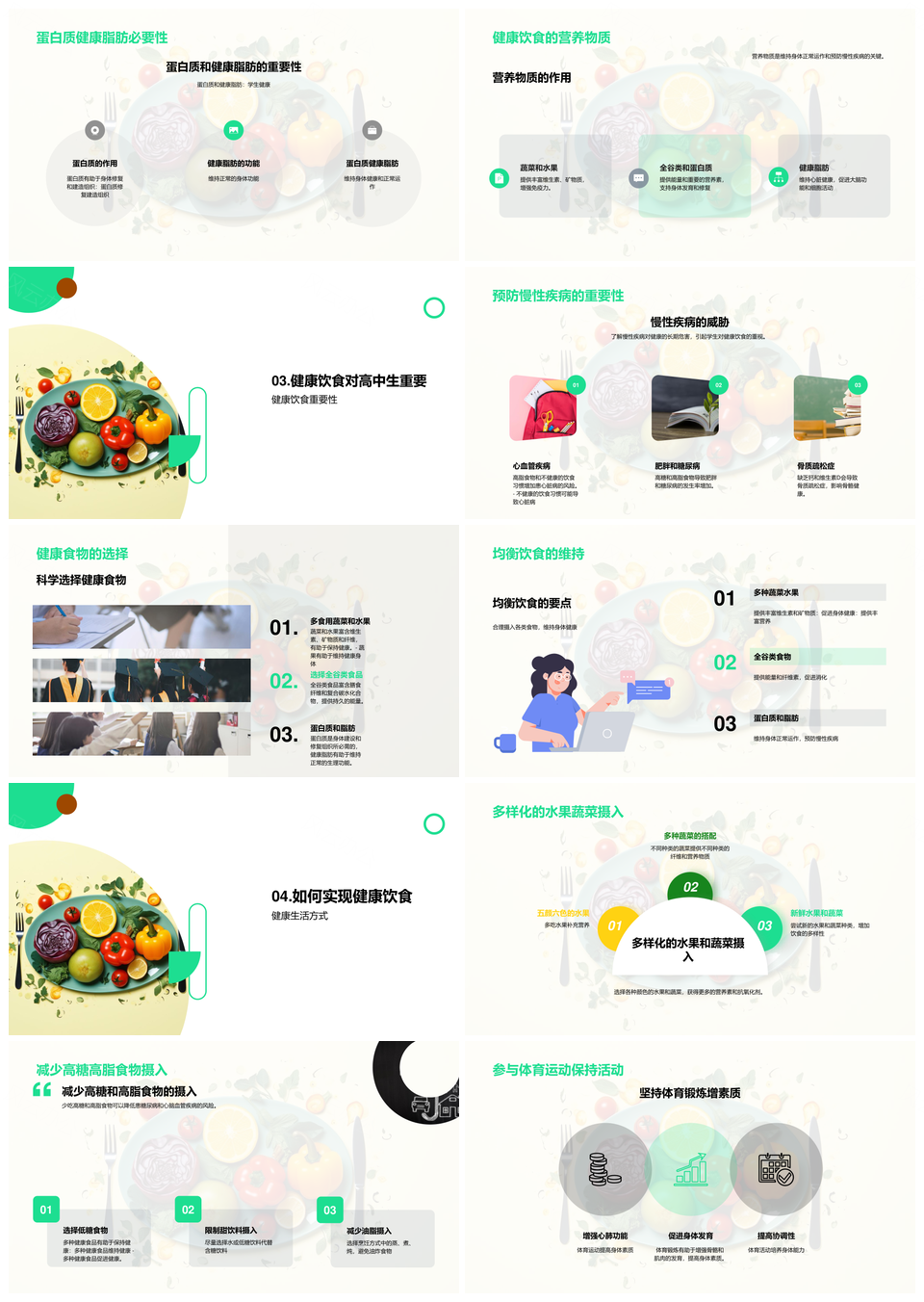 这是一张高中生健康饮食盘搭配蔬果全谷蛋白脂肪PPT模板,包含高中生、健康饮食盘、搭配、蔬果、全谷、蛋白、脂肪等主题内容,也可用作高中生健康饮食搭配蔬果全谷、健康饮食搭配蔬果全谷、搭配蔬果全谷蛋白、搭配全谷蛋白脂肪、健康饮食全谷蛋白脂肪、高中生健康饮食搭配、健康饮食蔬果全谷、健康饮食搭配蔬果、健康饮食搭配全谷、健康饮食搭配蛋白、健康饮食搭配脂肪、蔬果全谷蛋白脂肪、搭配蔬果全谷、搭配全谷蛋白、全谷蛋白脂肪等PPT场景使用。 风云办公提供的高中生健康饮食盘搭配蔬果全谷蛋白脂肪PPT模板,下载格式为pptx,一共18页,作品中文字及图均可以修改和编辑,图片更改请在作品中右键图片并更换,文字修改请直接点击文字进行修改。