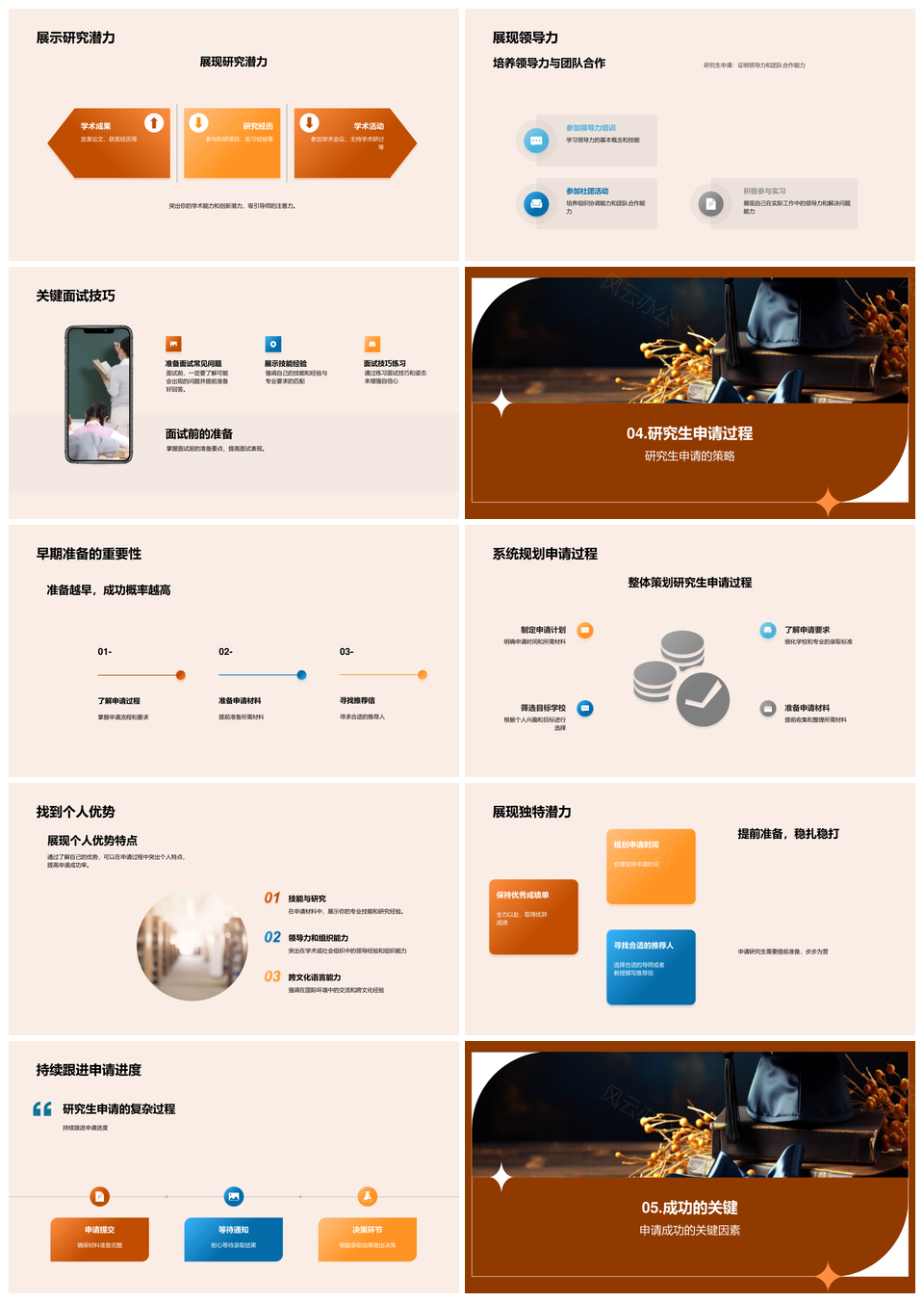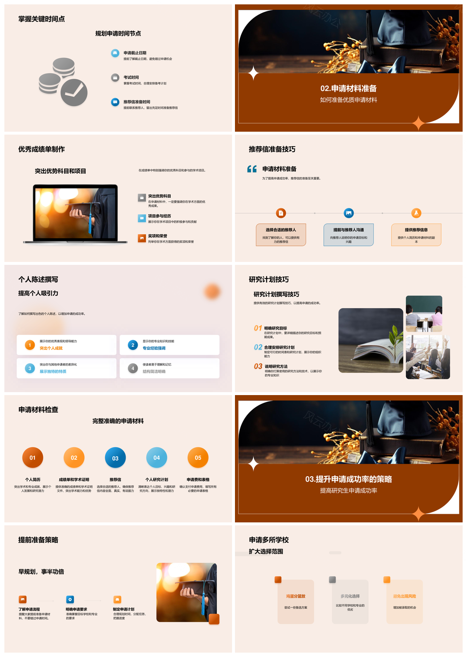 这是一张研究生申请攻略录取选校时间材料推荐信陈述PPT模板,包含研究生、申请、攻略、录取、选校、时间、材料、推荐信、陈述等主题内容,也可用作研究生申请攻略录取选校、研究生申请材料推荐信、录取选校时间材料、推荐信陈述攻略时间、申请攻略选校材料、研究生录取时间陈述、研究生推荐信陈述材料、攻略录取选校时间、选校时间推荐信陈述、申请录取材料陈述、研究生推荐信攻略、攻略选校材料时间、录取材料推荐信攻略、研究生时间陈述材料、推荐信选校申请攻略等PPT场景使用。 风云办公提供的研究生申请攻略录取选校时间材料推荐信陈述PPT模板,下载格式为pptx,一共33页,作品中文字及图均可以修改和编辑,图片更改请在作品中右键图片并更换,文字修改请直接点击文字进行修改。