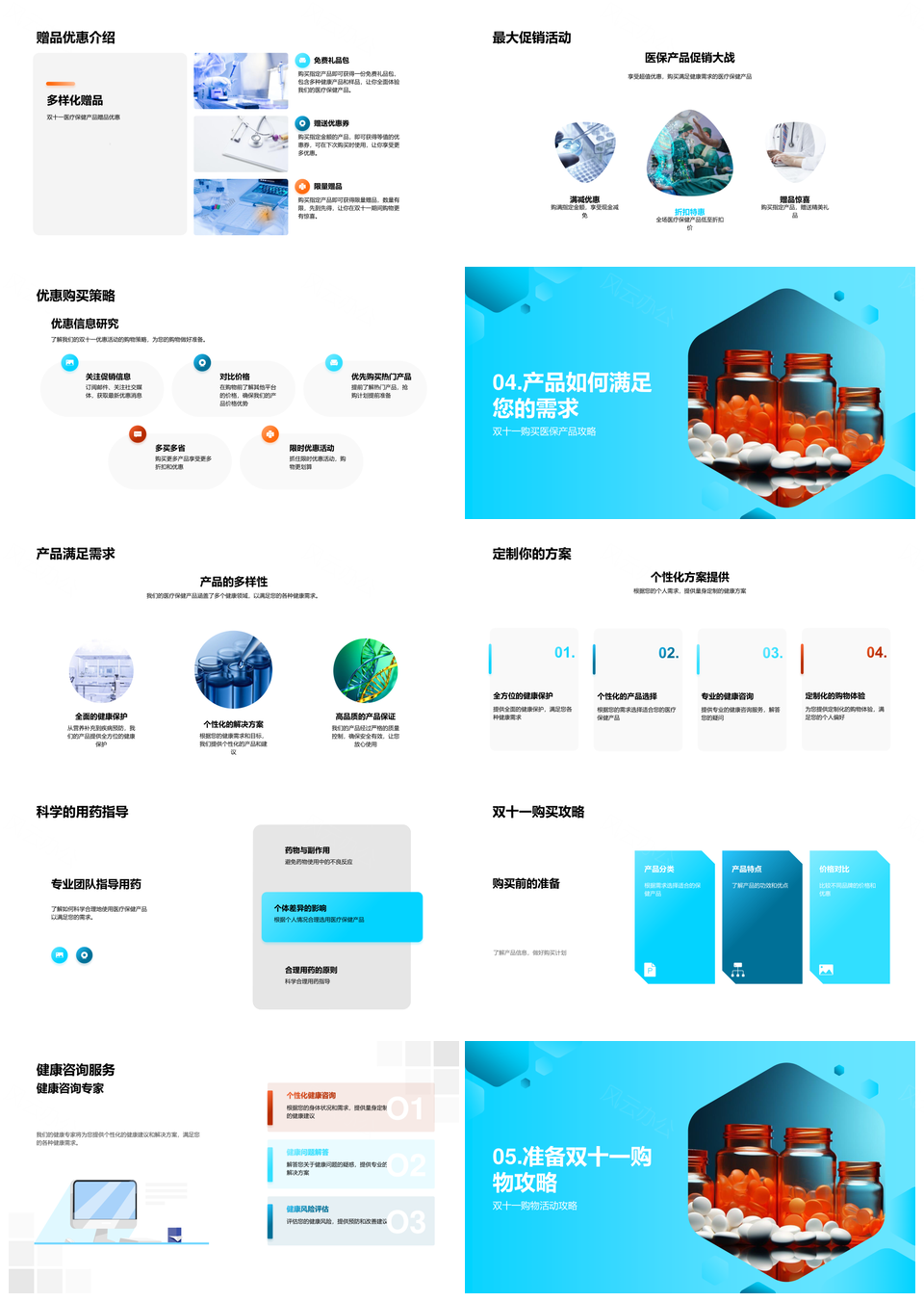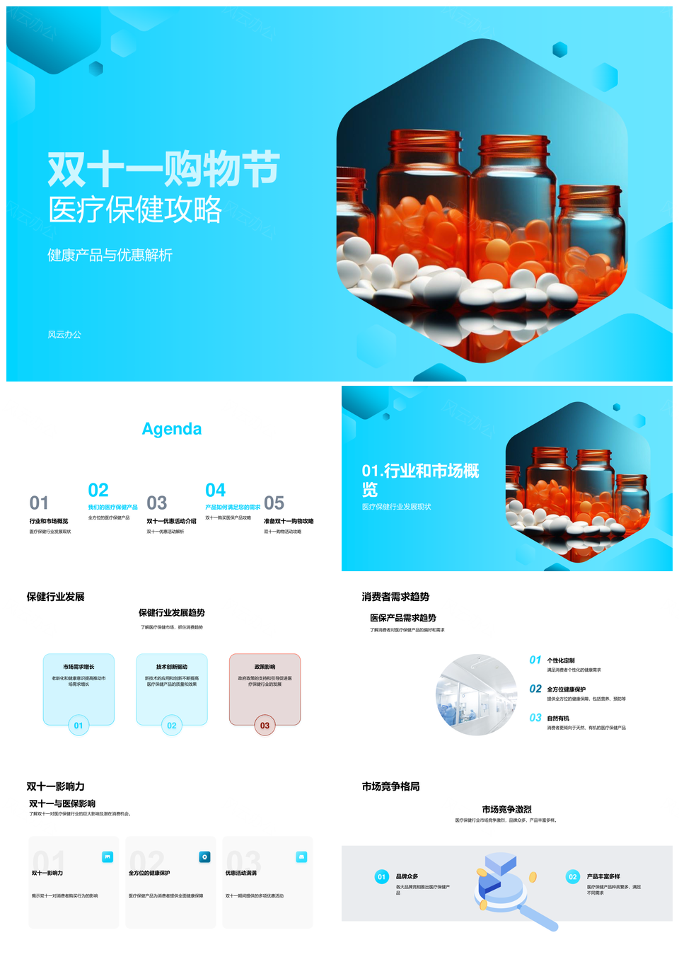 风云办公提供的双十一医疗健康产品优惠与防护攻略PPT模板,下载格式为pptx,一共33页,作品中文字及图均可以修改和编辑,图片更改请在作品中右键图片并更换,文字修改请直接点击文字进行修改。
