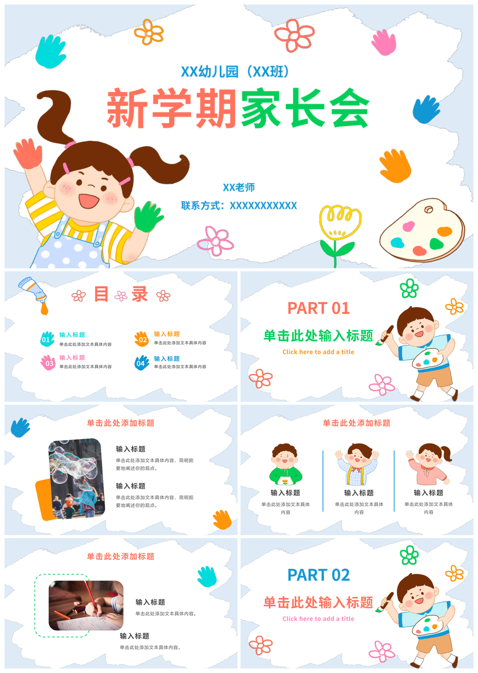 2025蓝色小清新可爱卡通家长会幼儿园小学PPT模板