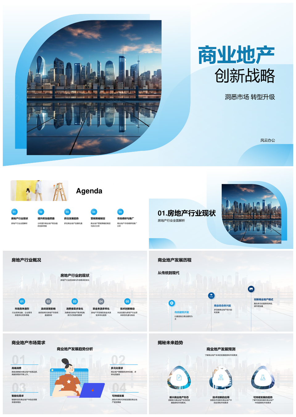 风云办公提供的商业地产创新战略趋势与营销发展PPT模板,下载格式为pptx,一共28页,作品中文字及图均可以修改和编辑,图片更改请在作品中右键图片并更换,文字修改请直接点击文字进行修改。