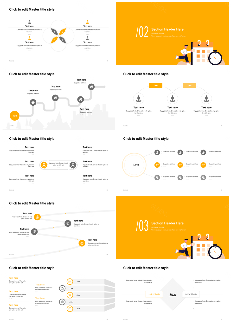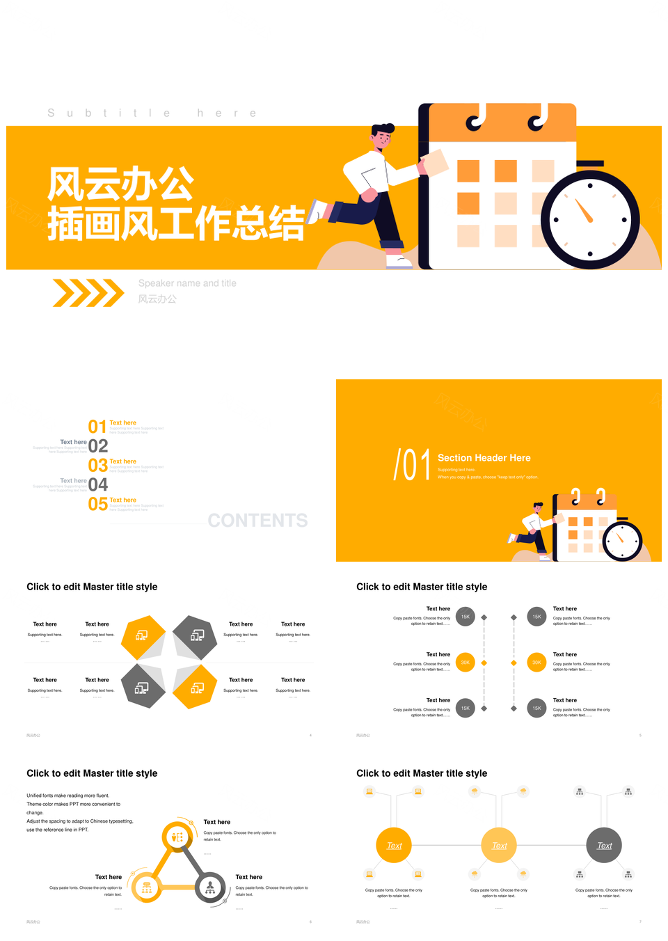 这款插画风PPT模板以明亮黄与纯净白为主色调,将卡通元素与极简设计巧妙融合,兼顾专业与创意。模块化布局清晰直观,视觉层次分明,适合商务提案、项目总结等场景。扁平化插画轻松减龄,同时保留职场所需的稳重感,重点数据模块可一键替换,提升效率。内容页涵盖逻辑图表、场景化示意图及多图文排版,适配市场分析、产品发布等需求,无需复杂设计即可塑造干练气质。中性色调与留白设计确保视觉平衡,兼容投影与屏幕展示,轻松传递核心信息。