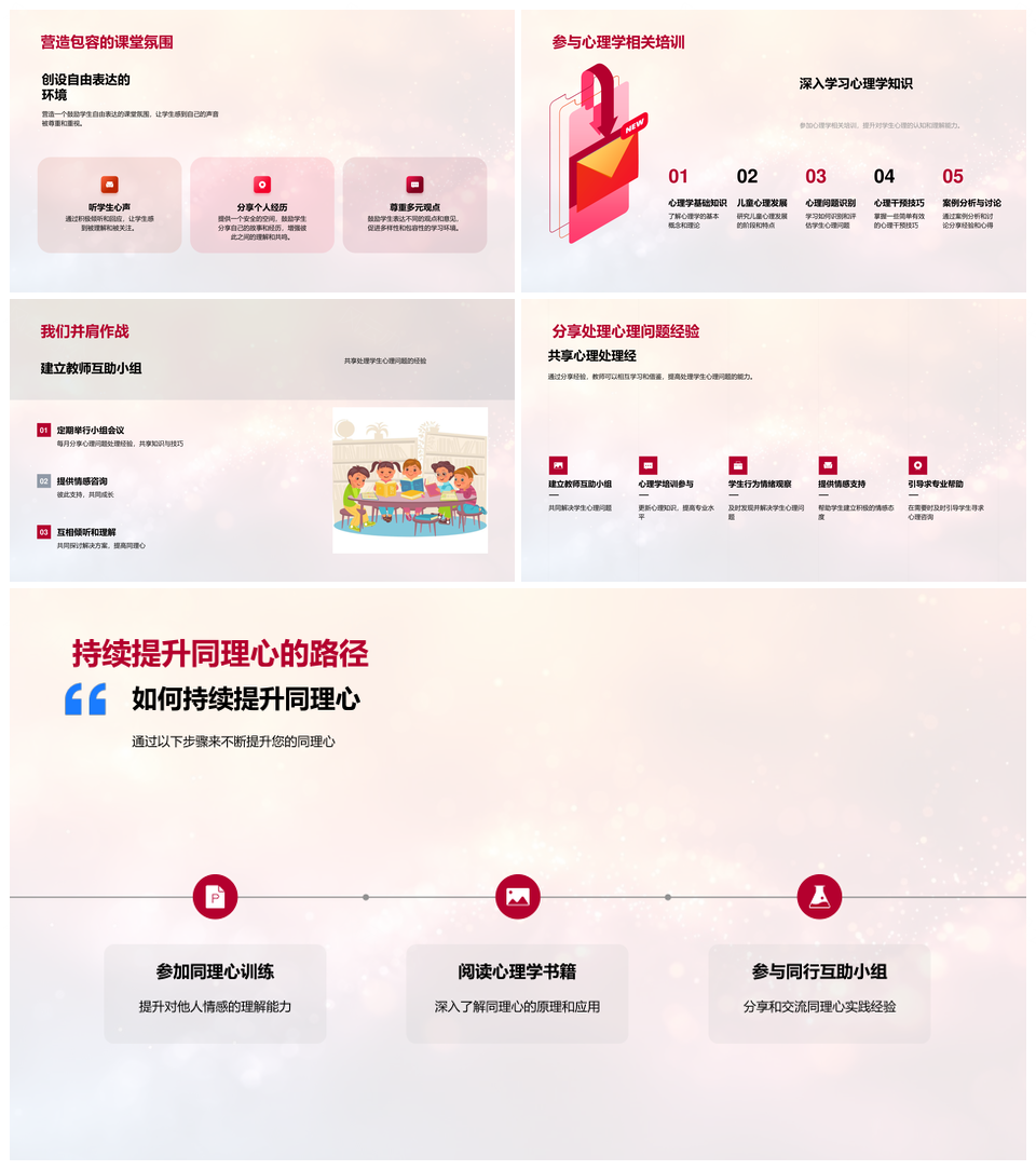 这是一张教师培养同理心促进学生情感心理理解PPT模板,包含教师、培养、同理心、促进、学生、情感、心理、理解等主题内容,也可用作教师培养同理心促进、培养同理心促进学生、教师促进心理情感理解、同理心促进学生情感、促进心理情感理解、学生情感心理理解、培养同理心促进、促进心理理解、教师培养同理心、心理情感理解、情感心理理解、促进理解、学生情感、心理理解、情感心理等PPT场景使用。