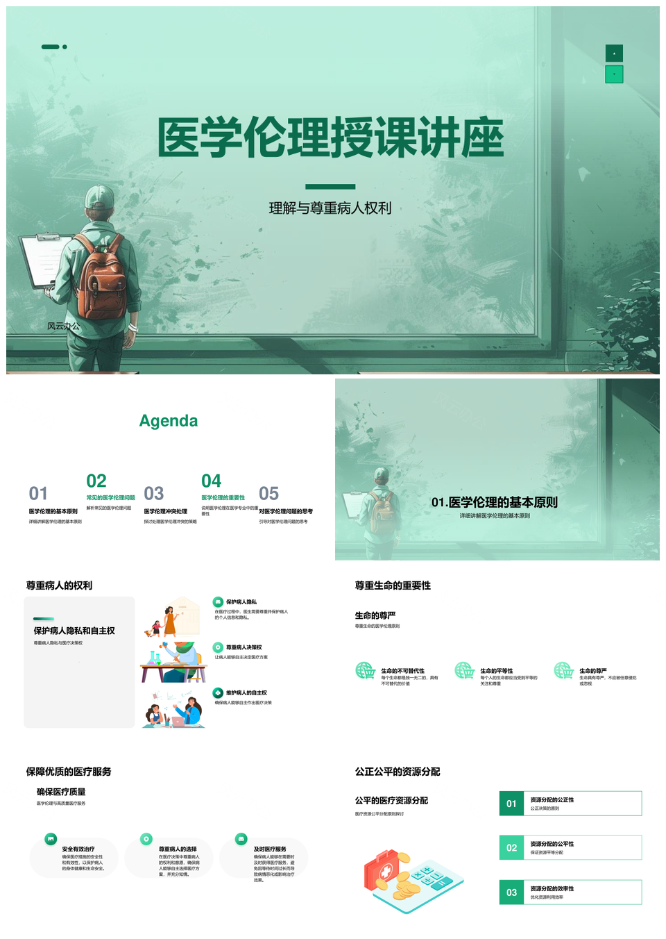 专为医学与伦理学课程设计的学术型PPT模板,采用淡绿主色配合抽象插画,视觉风格清新不失严谨。模板内容框架覆盖医疗服务案例分析、伦理决策逻辑推导等场景,每页版式均融入波粒二象性符号、激光光束等科学元素,通过点线面的动态组合传递学术深度。模块化图表支持课程知识点的阶梯式展开,预设伦理学原则对比表、医疗流程树状图等专业框架,辅以可编辑的分子结构图标与数据可视化组件,满足医学教学、科研汇报等多维需求,兼顾内容承载力与版式呼吸感。