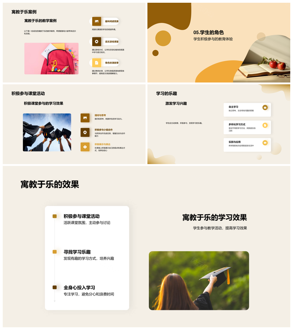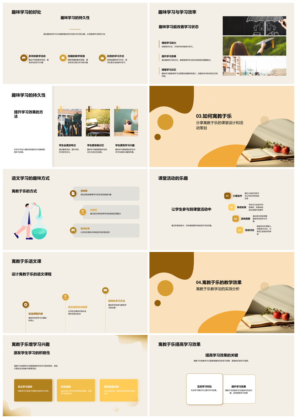 这是一张寓教于乐小学语文趣味课堂活动持久学习PPT模板,包含寓教于乐、小学语文、趣味课堂、活动、持久学习等主题内容,也可用作寓教于乐小学语文趣味课堂、寓教于乐趣味课堂活动学习、语文趣味课堂活动持久、小学语文课堂活动持久、趣味课堂活动持久学习、寓教于乐小学课堂活动、语文课堂活动持久学习、小学趣味课堂持久学习、寓教于乐语文课堂活动、小学语文趣味活动持久、课堂活动持久学习、寓教于乐语文趣味活动、小学趣味课堂活动、语文课堂活动学习、寓教于乐课堂学习等PPT场景使用。 风云办公提供的寓教于乐小学语文趣味课堂活动持久学习PPT模板,下载格式为pptx,一共23页,作品中文字及图均可以修改和编辑,图片更改请在作品中右键图片并更换,文字修改请直接点击文字进行修改。
