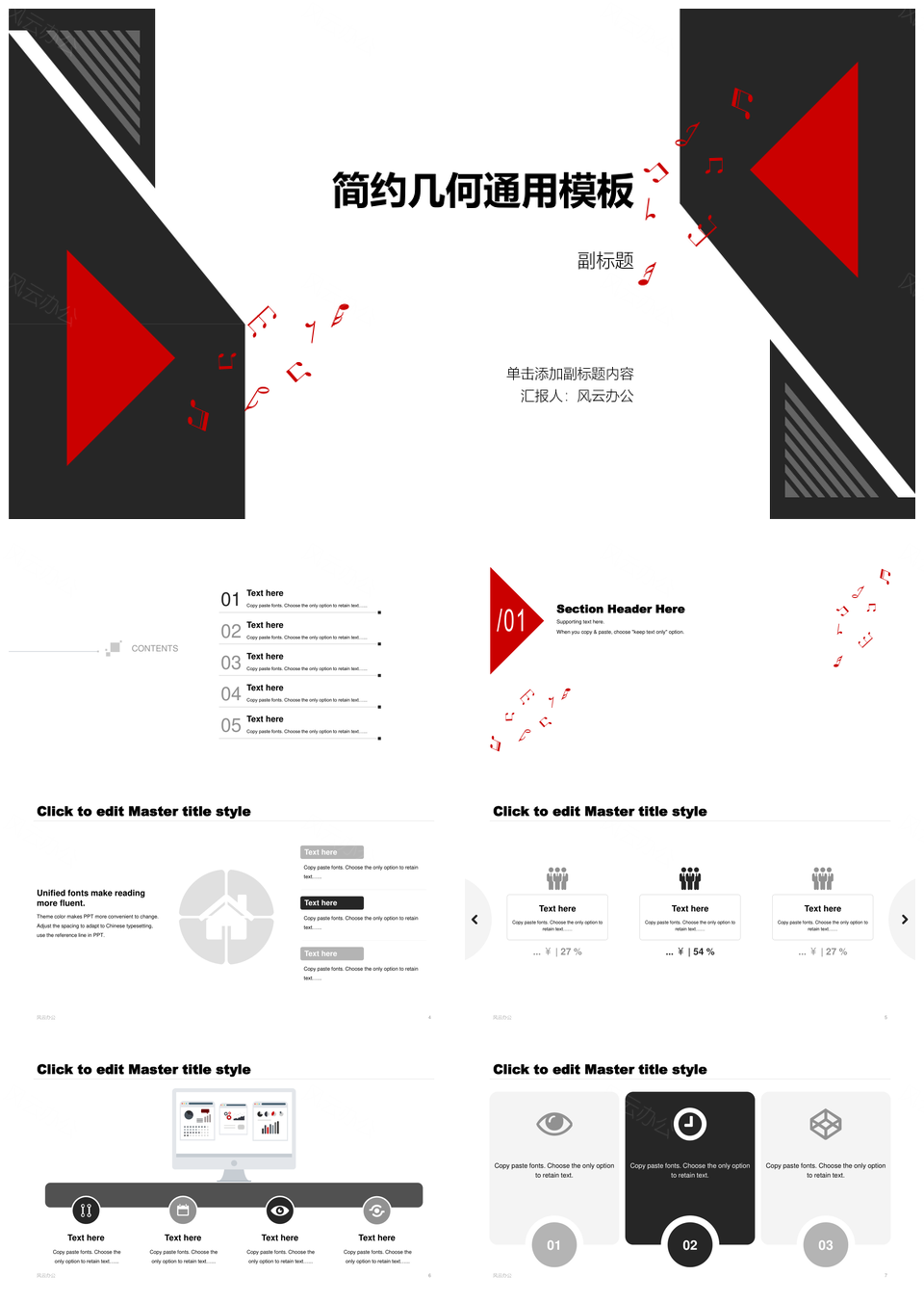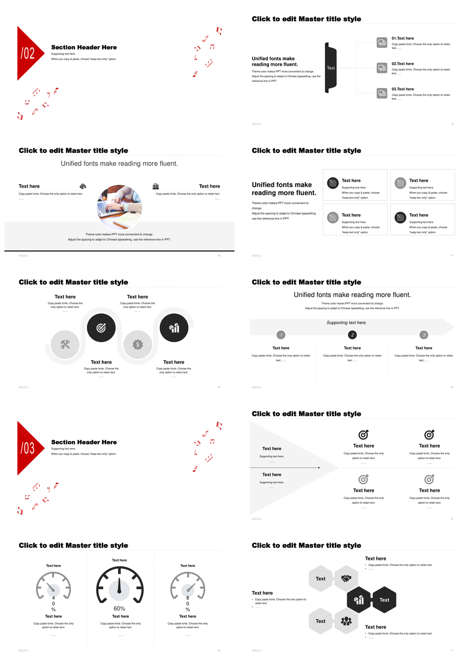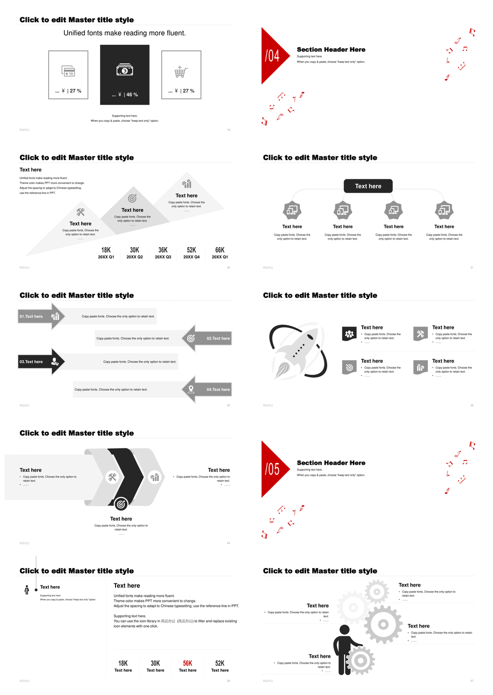 本模板采用极简商务风设计,以经典正红、黑色、白色为主色,传递专业与稳重感,扁平化图标与矢量图形确保任意比例缩放无损清晰,模块布局层级分明,逻辑直观适配数据分析、策略汇报等场景,文字排版兼容多语言内容,所有图表、配色支持一键替换,保留原版结构的同时满足高效修改,无冗余装饰元素,重点聚焦内容核心,适用于商业提案、职场报告、项目总结等需严谨表达的场合,兼顾视觉美感与实用效率,助力专业价值精准传递。
