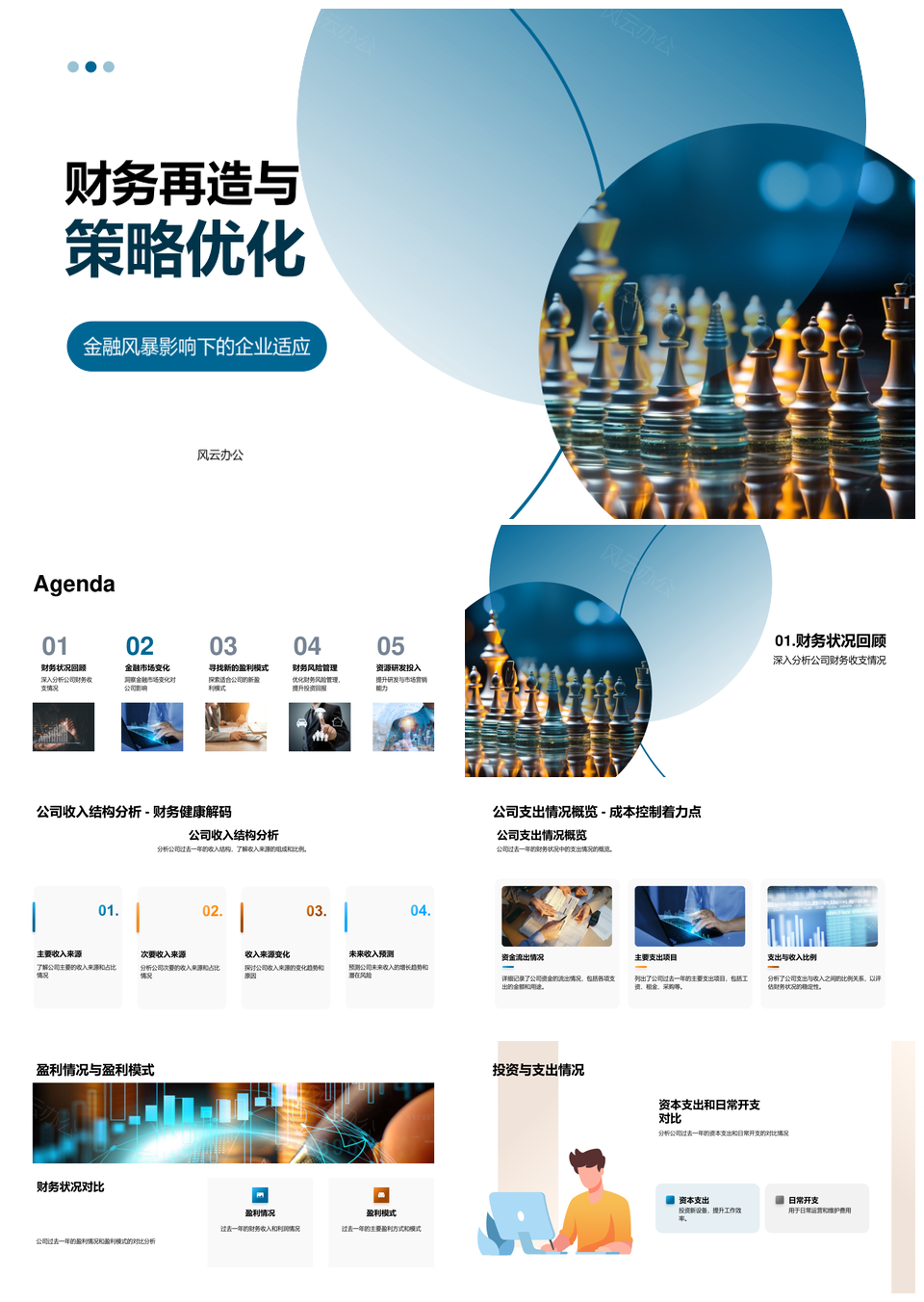 风云办公提供的财务再造策略优化抵御金融风暴风险PPT模板,下载格式为pptx,一共24页,作品中文字及图均可以修改和编辑,图片更改请在作品中右键图片并更换,文字修改请直接点击文字进行修改。