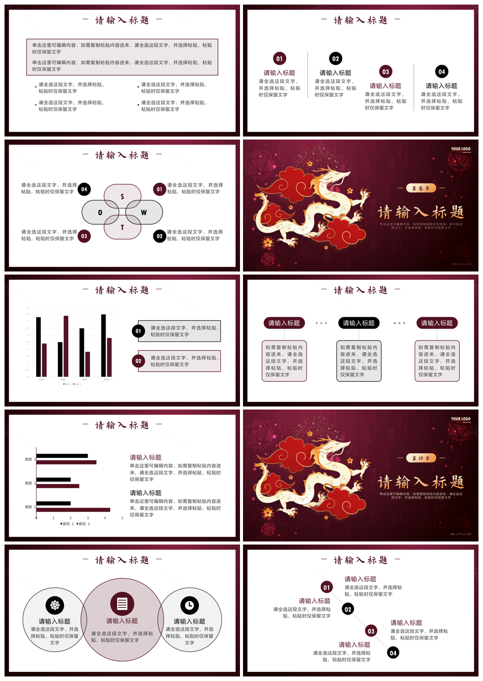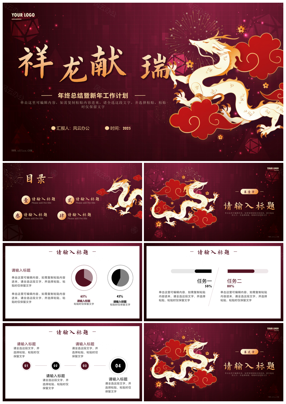 风云办公提供的2024龙年红色剪纸风工作计划PPT模板,下载格式为pptx,一共19页,作品中文字及图均可以修改和编辑,图片更改请在作品中右键图片并更换,文字修改请直接点击文字进行修改。