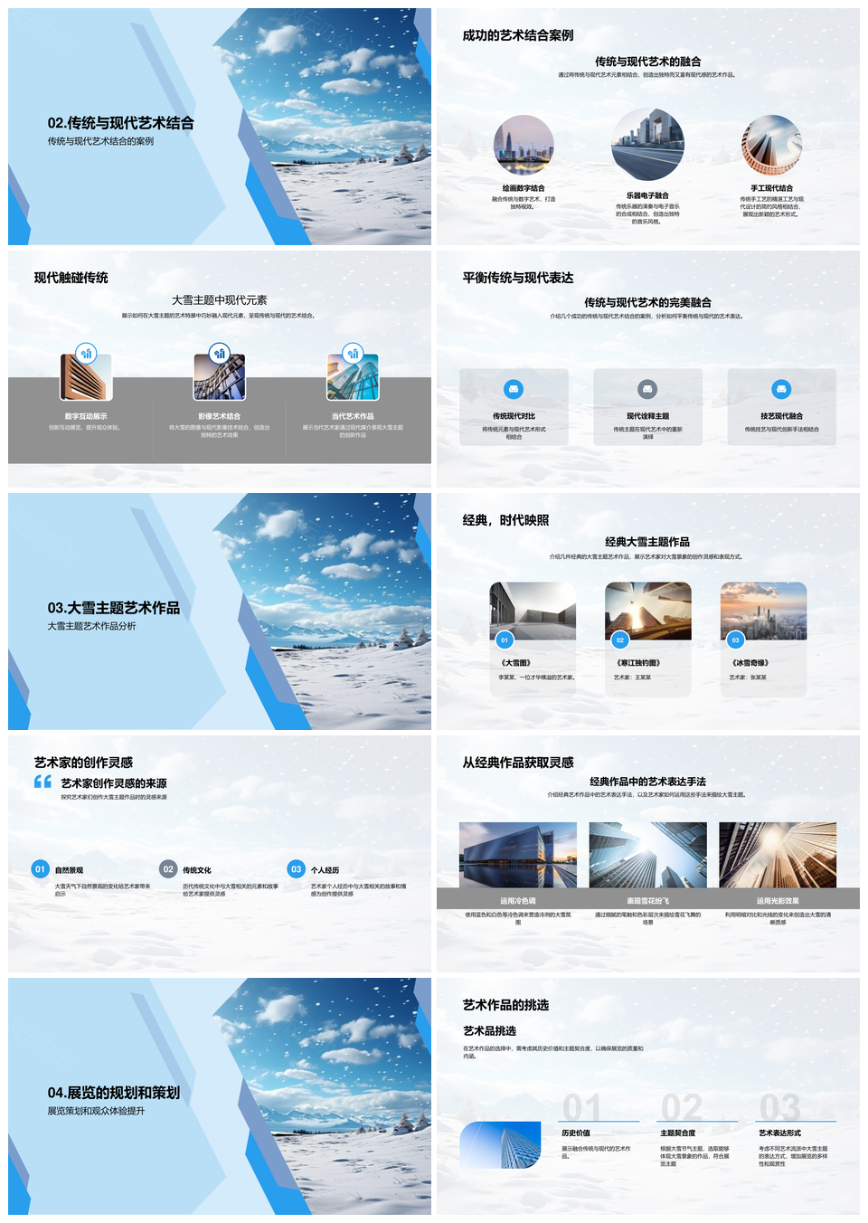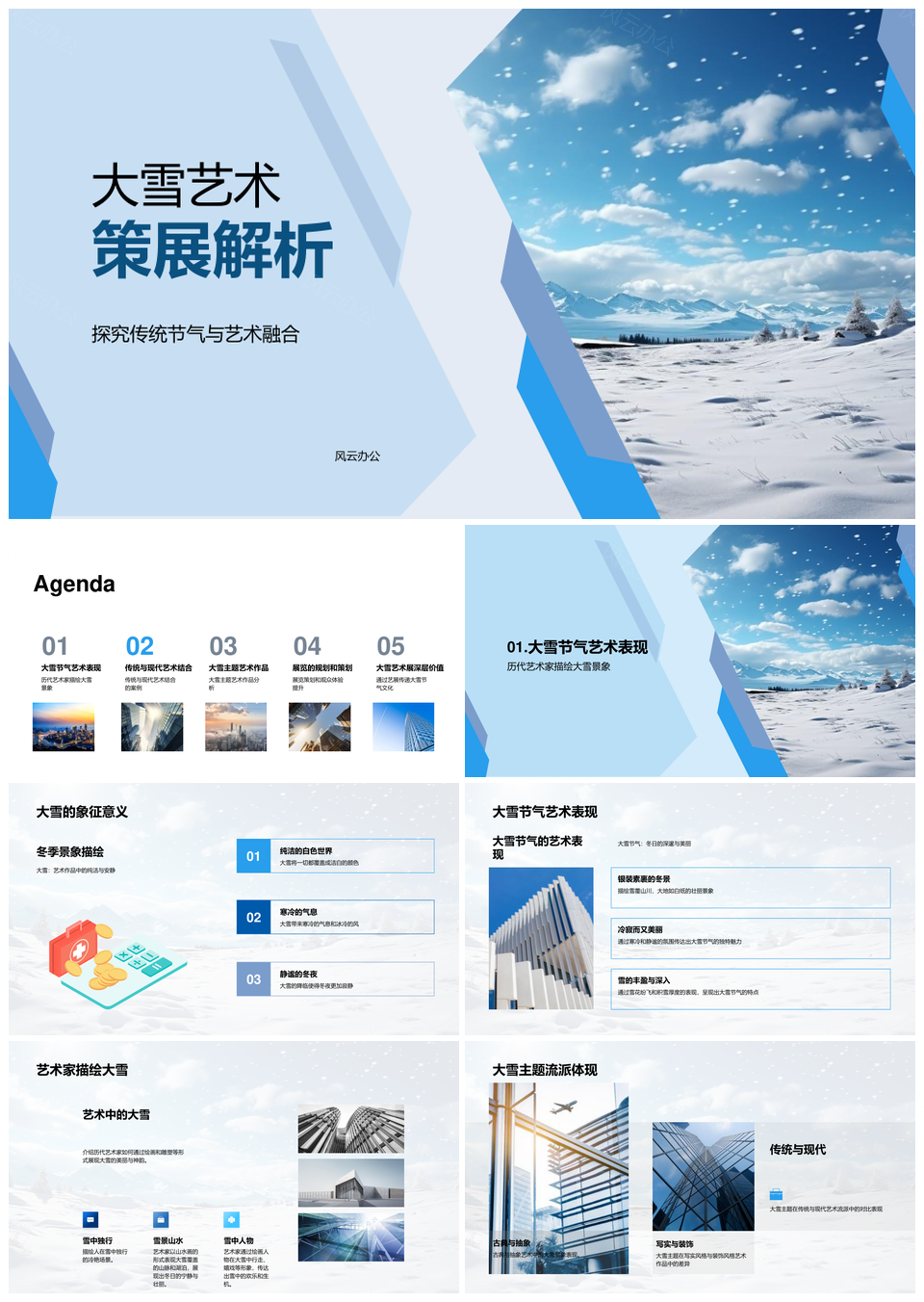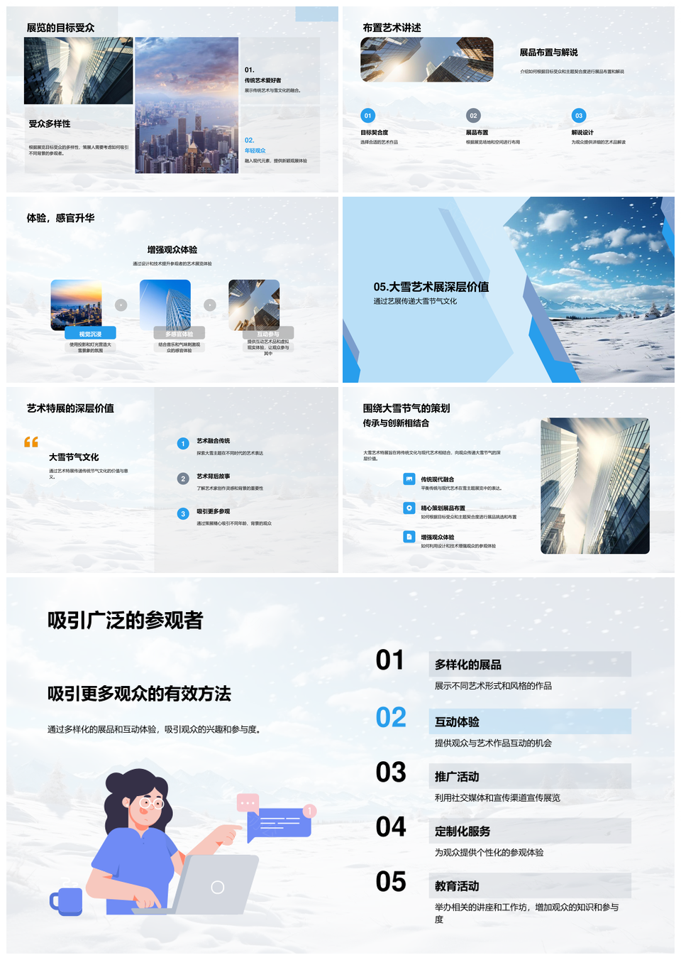 这款模板以艺术感为基调, 融合专业设计语言, 在简洁中展现独特美学。主视觉选用白色为基底, 搭配浅蓝与天蓝渐变, 传递冷静专业的氛围。版式强调留白与呼吸感, 细节处融入几何线条与微立体元素, 通过疏密有致的布局构建视觉层次。图文区域采用非对称设计, 兼顾创意与可读性, 每页的视觉重量经过精准配比。特别为高阶用户优化了内容承载逻辑, 图表架构可兼容复杂数据。整套设计摒弃冗余装饰, 以克制手法演绎精致感, 尤其适合需要呈现深度内容又不失格调的商务提案、学术汇报等场景, 帮助用户通过视觉秩序强化信息说服力。