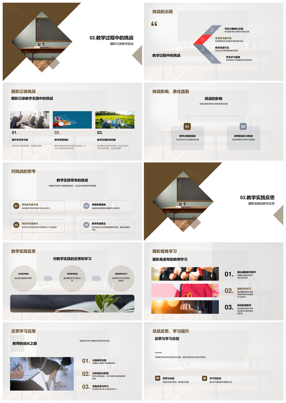 这是一张镜头捕捉教学挑战反思实践PPT模板,包含镜头、捕捉、教学、挑战、反思、实践等主题内容,也可用作镜头捕捉教学挑战、捕捉教学挑战反思、教学挑战反思实践、镜头捕捉教学、捕捉教学挑战、教学挑战反思、挑战反思实践、镜头捕捉、捕捉教学、教学挑战、挑战反思、反思实践、教学实践、捕捉挑战、挑战实践等PPT场景使用。 风云办公提供的镜头捕捉教学挑战反思实践PPT模板,下载格式为pptx,一共28页,作品中文字及图均可以修改和编辑,图片更改请在作品中右键图片并更换,文字修改请直接点击文字进行修改。