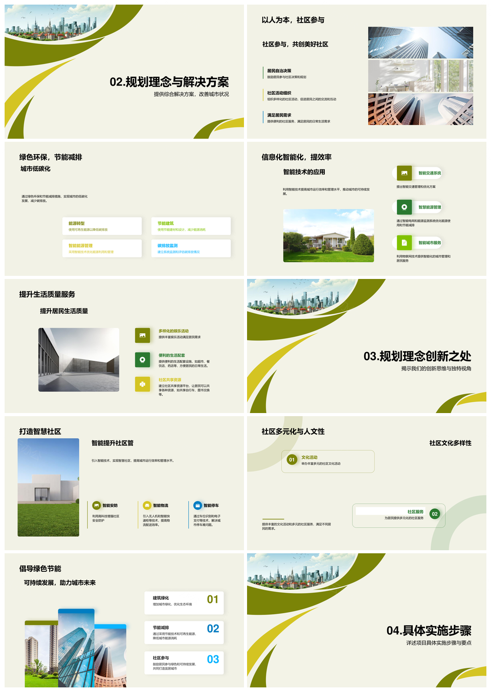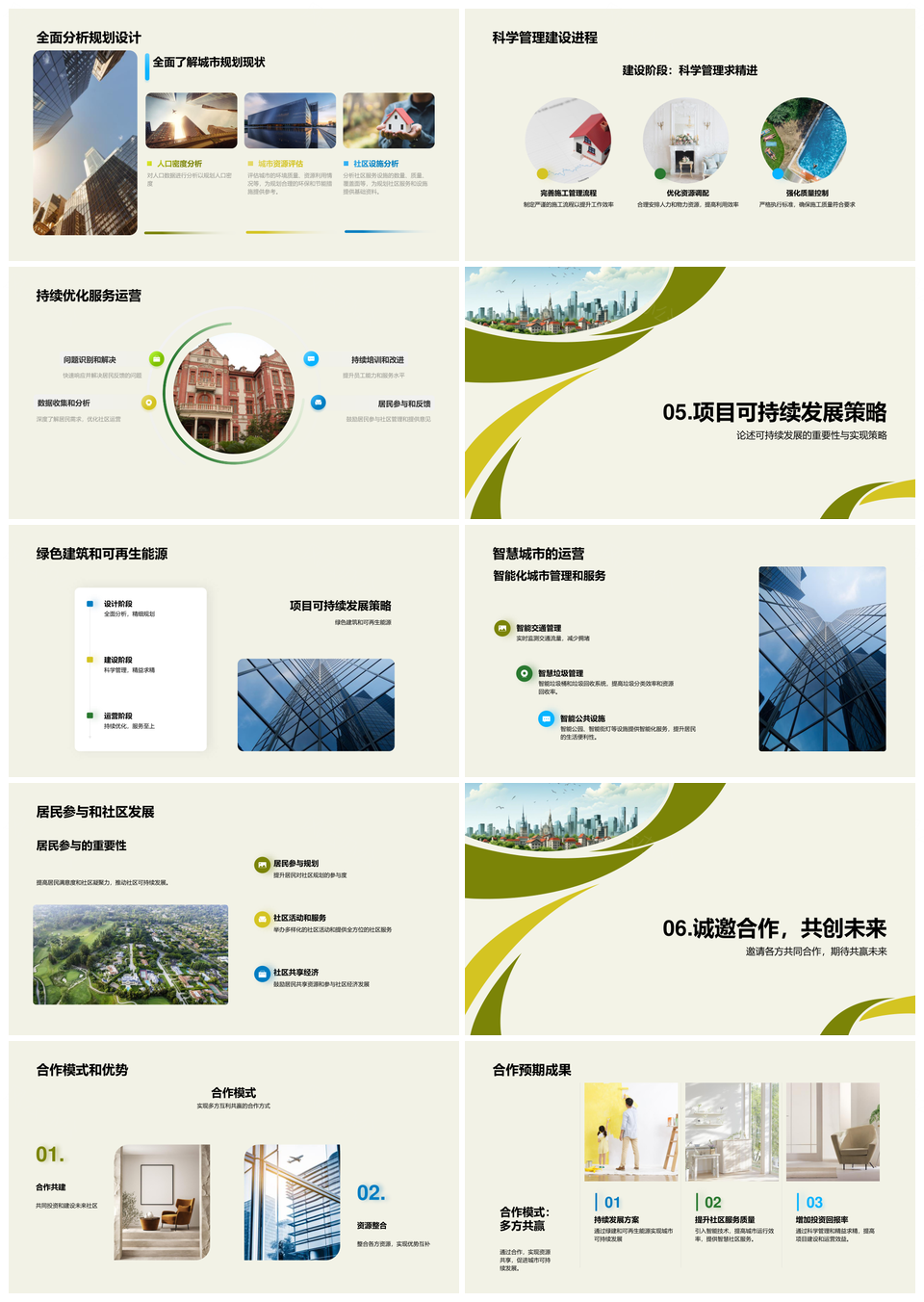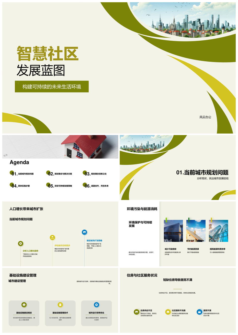风云办公提供的智慧社区绿色可持续城市蓝图PPT模板,下载格式为pptx,一共29页,作品中文字及图均可以修改和编辑,图片更改请在作品中右键图片并更换,文字修改请直接点击文字进行修改。