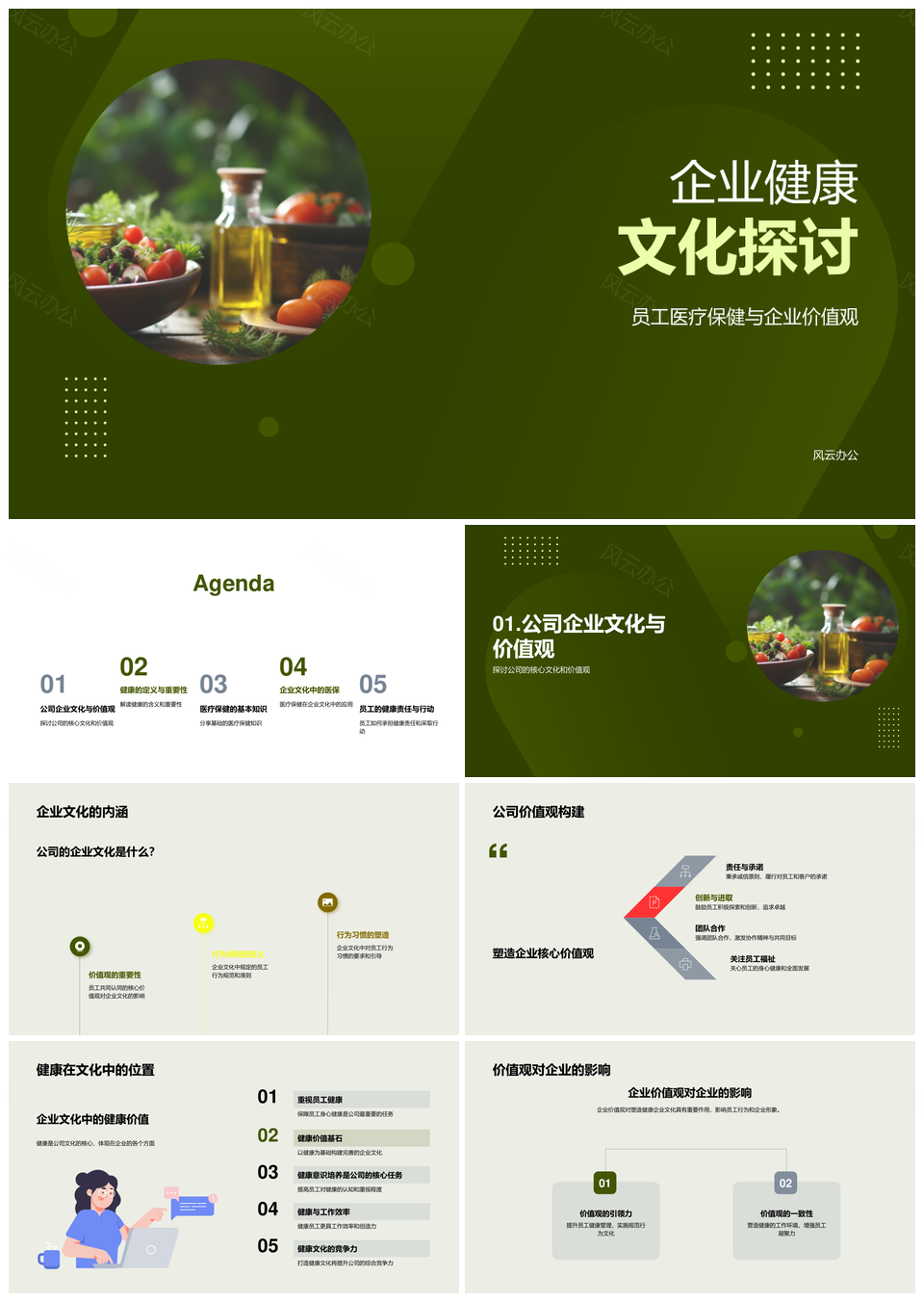 这是一张企业健康文化医疗保健价值观效率饮食运动PPT模板,包含企业、健康文化、医疗保健、价值观、效率、饮食、运动等主题内容,也可用作企业健康文化医疗保健、健康医疗保健饮食运动、企业健康文化医疗保健、健康饮食运动医疗保健、企业医疗保健价值观效率、医疗保健价值观效率饮食、价值观效率饮食运动、企业健康文化、健康饮食运动、医疗保健价值观效率、企业医疗保健文化、健康文化医疗保健、效率饮食运动、企业健康饮食、健康医疗保健、健康运动饮食等PPT场景使用。 风云办公提供的企业健康文化医疗保健价值观效率饮食运动PPT模板,下载格式为pptx,一共33页,作品中文字及图均可以修改和编辑,图片更改请在作品中右键图片并更换,文字修改请直接点击文字进行修改。