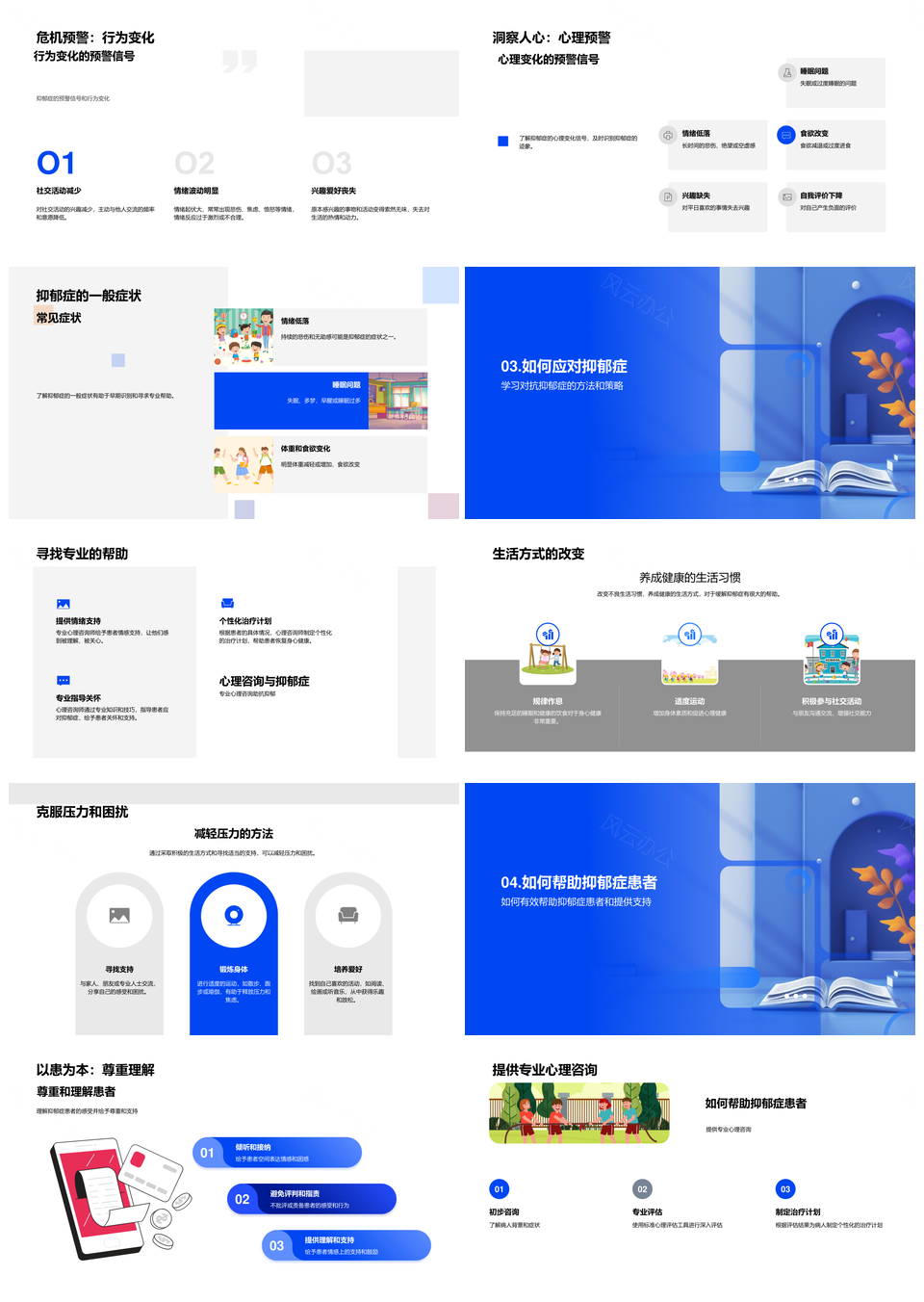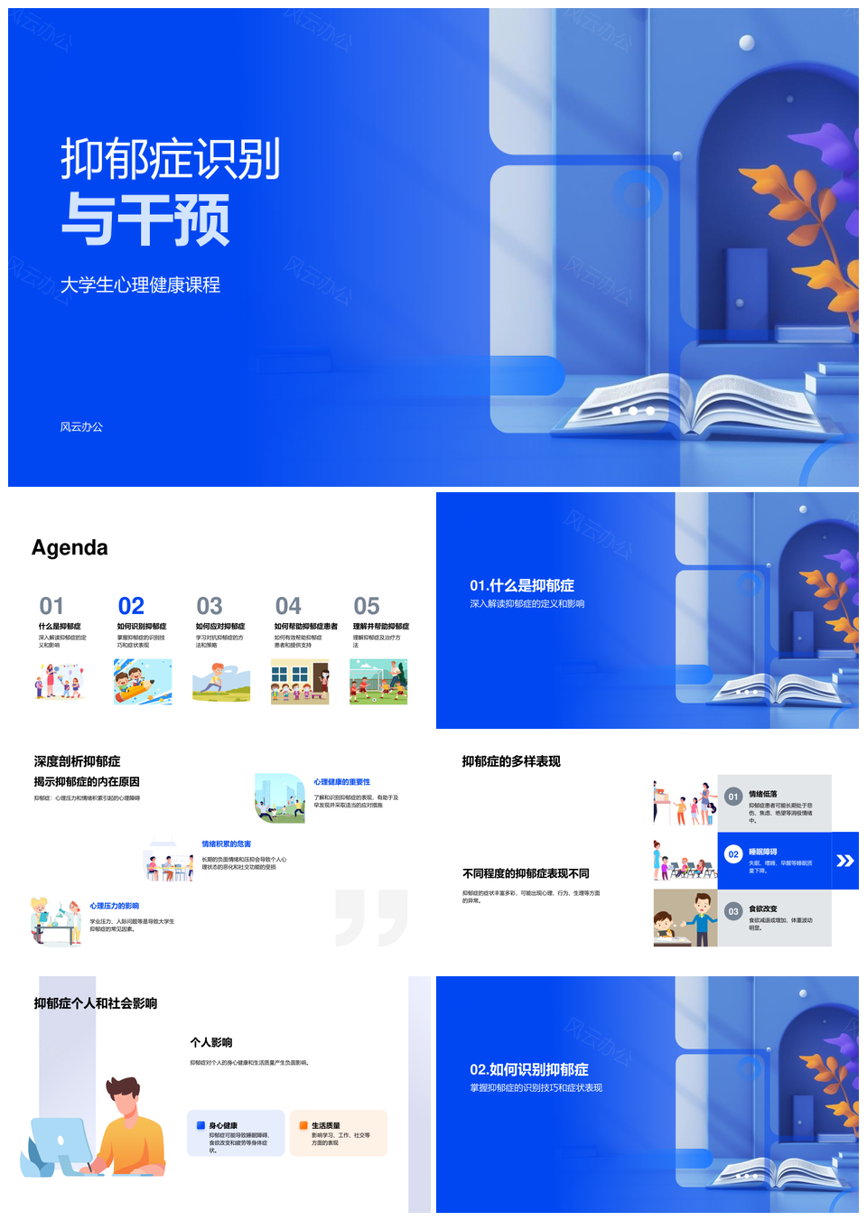 这是一张大学生抑郁症症状识别干预心理健康教育PPT模板,包含大学生、抑郁症、症状、识别、干预、心理健康、教育等主题内容,也可用作大学生抑郁症症状识别干预、抑郁症症状识别干预心理健康教育、大学生抑郁症症状识别、抑郁症症状识别干预、症状识别干预心理健康教育、大学生抑郁症症状、抑郁症症状识别、症状识别干预、识别干预心理健康教育、大学生抑郁症、抑郁症症状、症状识别、识别干预、干预心理健康教育、大学生心理健康教育等PPT场景使用。 风云办公提供的大学生抑郁症症状识别干预心理健康教育PPT模板,下载格式为pptx,一共23页,作品中文字及图均可以修改和编辑,图片更改请在作品中右键图片并更换,文字修改请直接点击文字进行修改。