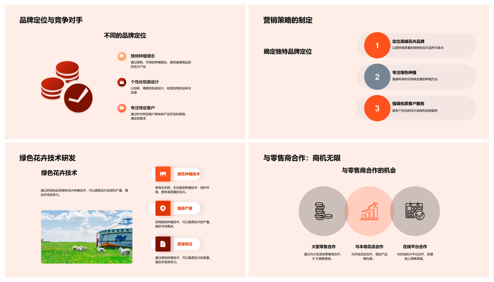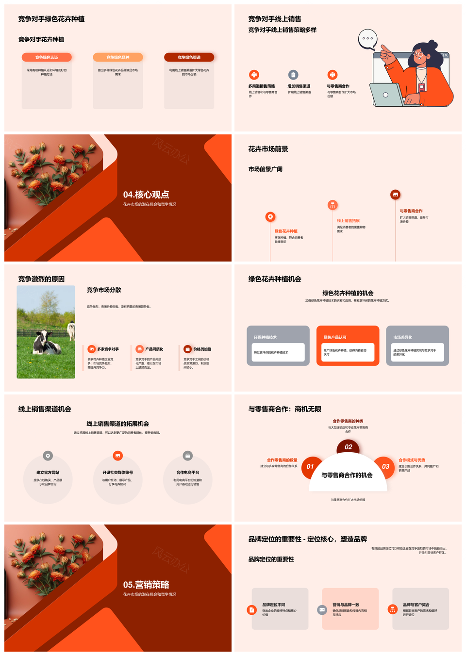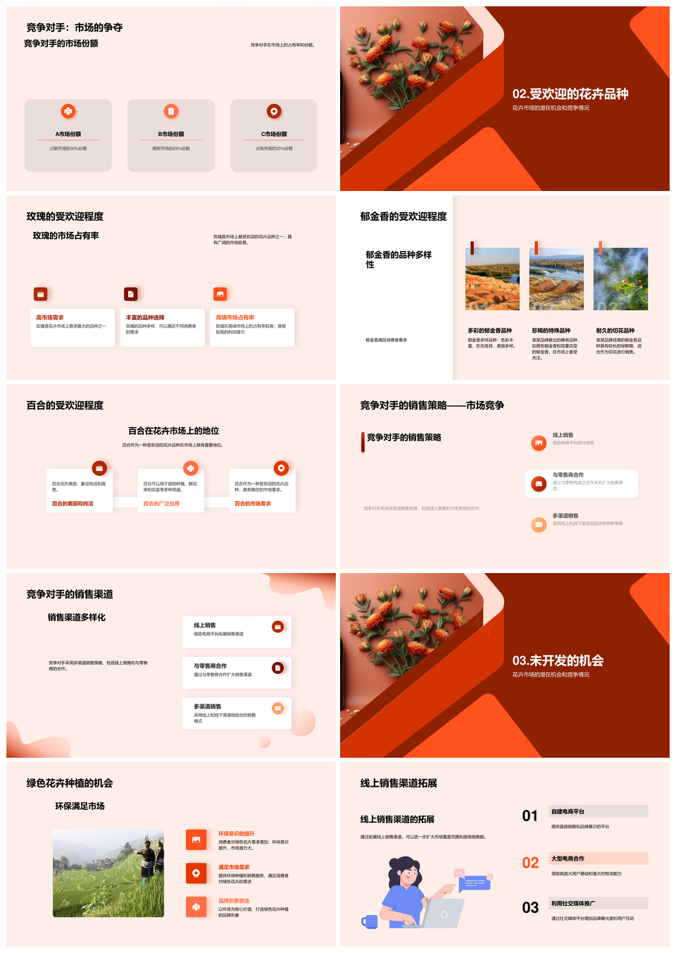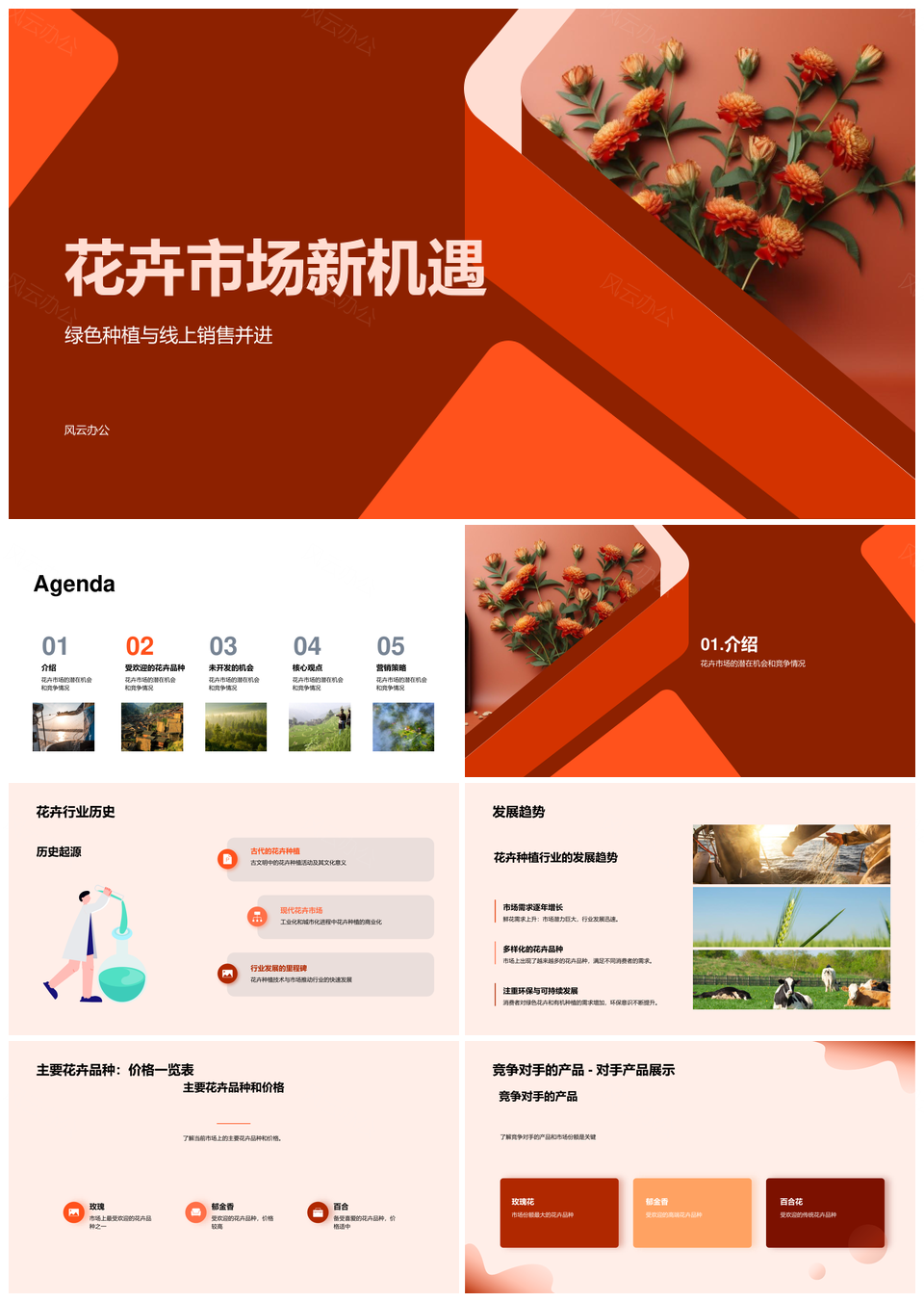 风云办公提供的花卉市场绿色种植多渠营销竞争趋势PPT模板,下载格式为pptx,一共32页,作品中文字及图均可以修改和编辑,图片更改请在作品中右键图片并更换,文字修改请直接点击文字进行修改。
