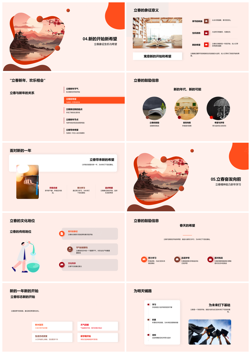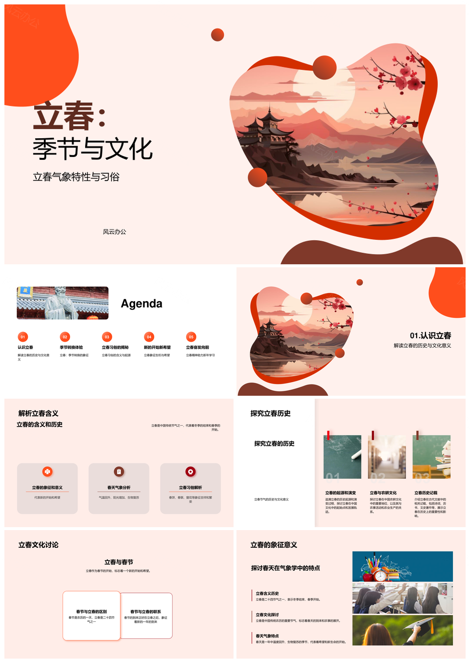 风云办公提供的立春季节转换气象特性与传统风俗文化PPT模板,下载格式为pptx,一共28页,作品中文字及图均可以修改和编辑,图片更改请在作品中右键图片并更换,文字修改请直接点击文字进行修改。