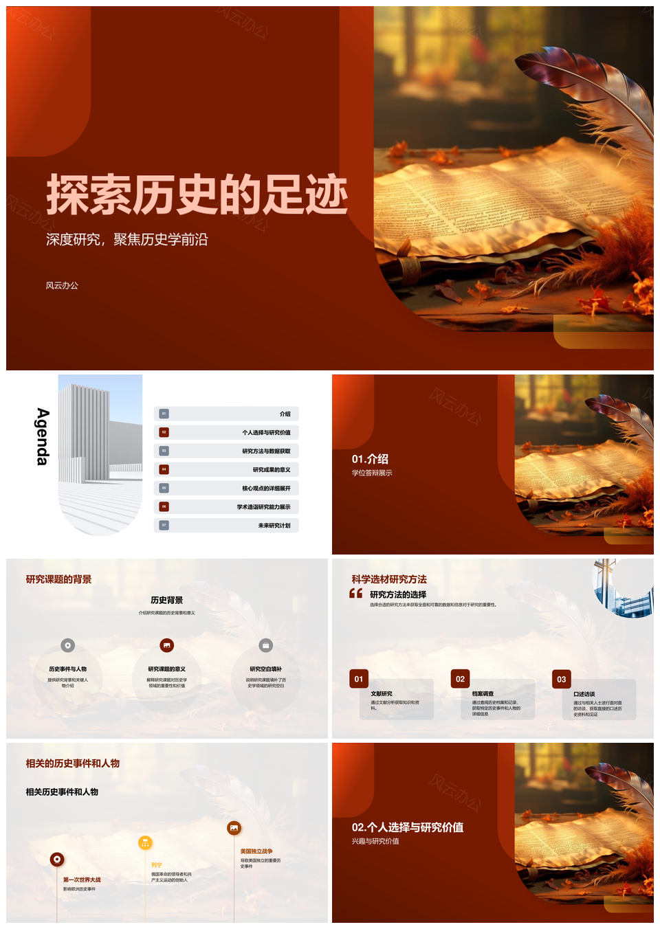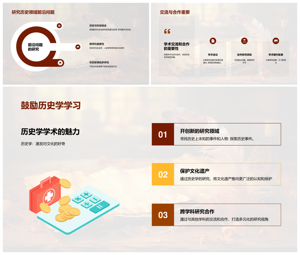 本模板专为学术研究与历史主题设计,采用红橙渐变主色调,传递严谨与厚重感。背景融入古籍卷轴纹理,搭配书写笔触元素,呼应知识传承脉络。核心页以波粒二象性原理图为灵感,抽象激光光束贯穿版面,展现科学探索的精确性。适用于物理学讲座、历史研究成果汇报等场景,通过模块化架构保证内容逻辑清晰,学术图标、时间轴等可视化组件均已优化。设计细节节制克制,仅以卷轴动态展开效果点睛,确保学术演示的专业格调与视觉说服力。