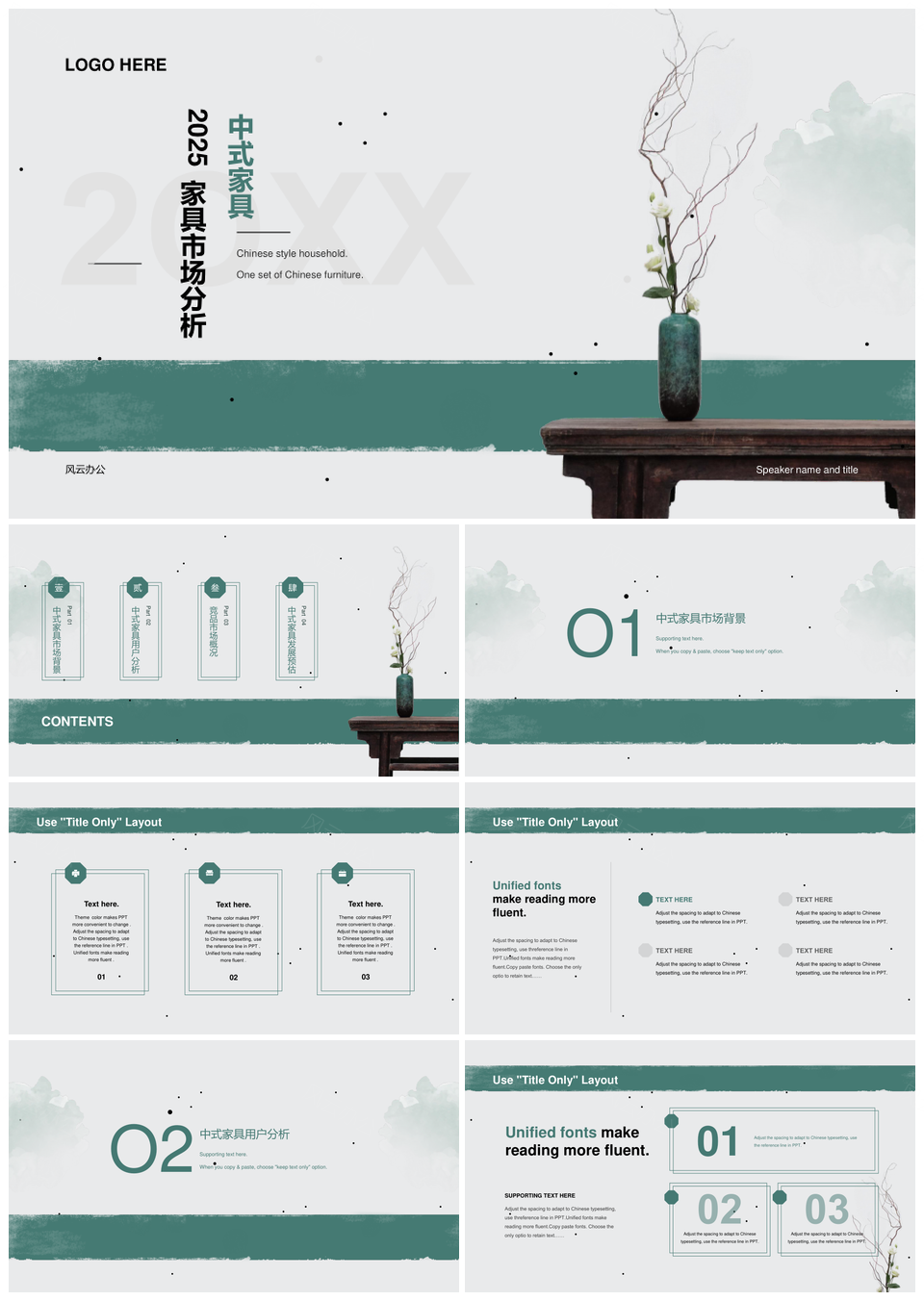 这是一张2025灰色国风中式家具水墨茶几桌台市场分析PPT模板,包含2025、灰色、国风、中式、家具、水墨、茶几、桌台、市场、分析等主题内容,也可用作灰色国风中式家具水墨茶几桌台、国风中式家具水墨茶几桌台、中式家具水墨茶几桌台、家具水墨茶几桌台市场分析、水墨茶几桌台市场分析、灰色国风中式家具水墨、国风中式家具水墨茶几、中式家具水墨茶几桌台、家具水墨茶几桌台市场、水墨茶几桌台市场分析、灰色国风家具水墨、国风中式家具桌台、中式家具桌台市场、灰色国风茶几、家具水墨桌台等PPT场景使用。 风云办公提供的2025灰色国风中式家具水墨茶几桌台市场分析PPT模板,下载格式为pptx,一共14页,作品中文字及图均可以修改和编辑,图片更改请在作品中右键图片并更换,文字修改请直接点击文字进行修改。