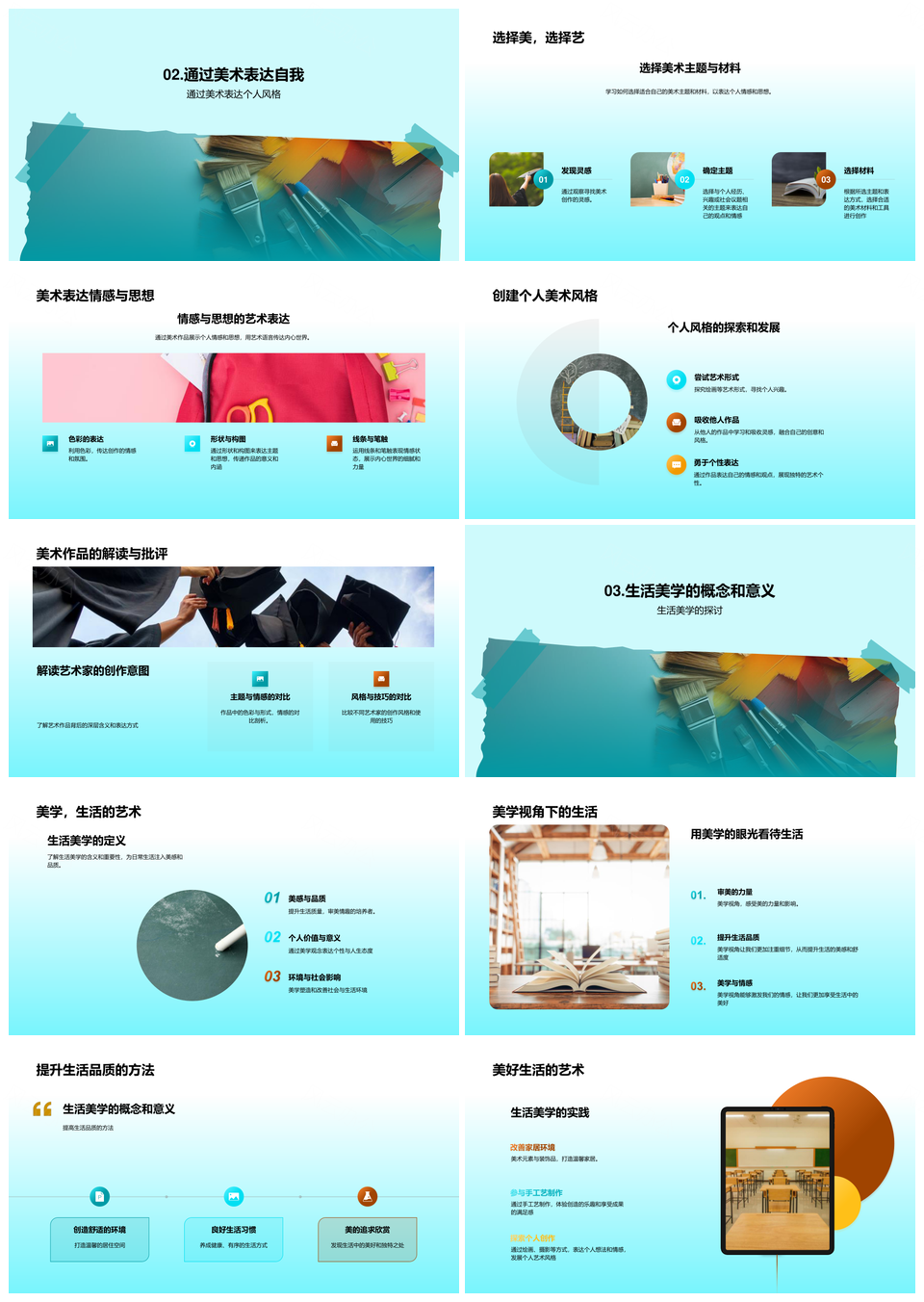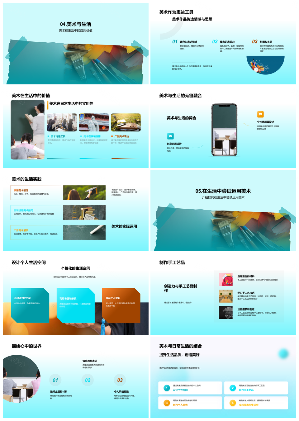 这是一张美术融入生活提升品质课堂设计装饰创意画笔PPT模板,包含美术、融入、生活、提升、品质、课堂、设计、装饰、创意、画笔等主题内容,也可用作美术融入生活提升品质、课堂设计装饰创意画笔、美术融入生活、生活提升品质、课堂设计装饰、装饰创意画笔、融入生活提升品质、提升品质课堂设计、课堂设计装饰创意、设计装饰创意画笔、美术设计装饰创意、装饰创意提升品质、创意画笔融入生活、生活创意课堂设计、美术课堂创意装饰等PPT场景使用。 风云办公提供的美术融入生活提升品质课堂设计装饰创意画笔PPT模板,下载格式为pptx,一共28页,作品中文字及图均可以修改和编辑,图片更改请在作品中右键图片并更换,文字修改请直接点击文字进行修改。