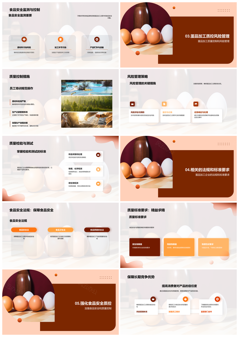 风云办公提供的蛋品加工食品安全质量控制与风险管理PPT模板,下载格式为pptx,一共24页,作品中文字及图均可以修改和编辑,图片更改请在作品中右键图片并更换,文字修改请直接点击文字进行修改。