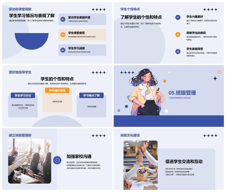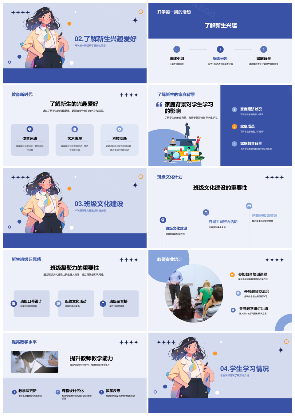 风云办公提供的蓝色卡通新生老师开学第一课自我介绍PPT模板,下载格式为pptx,一共24页,作品中文字及图均可以修改和编辑,图片更改请在作品中右键图片并更换,文字修改请直接点击文字进行修改。