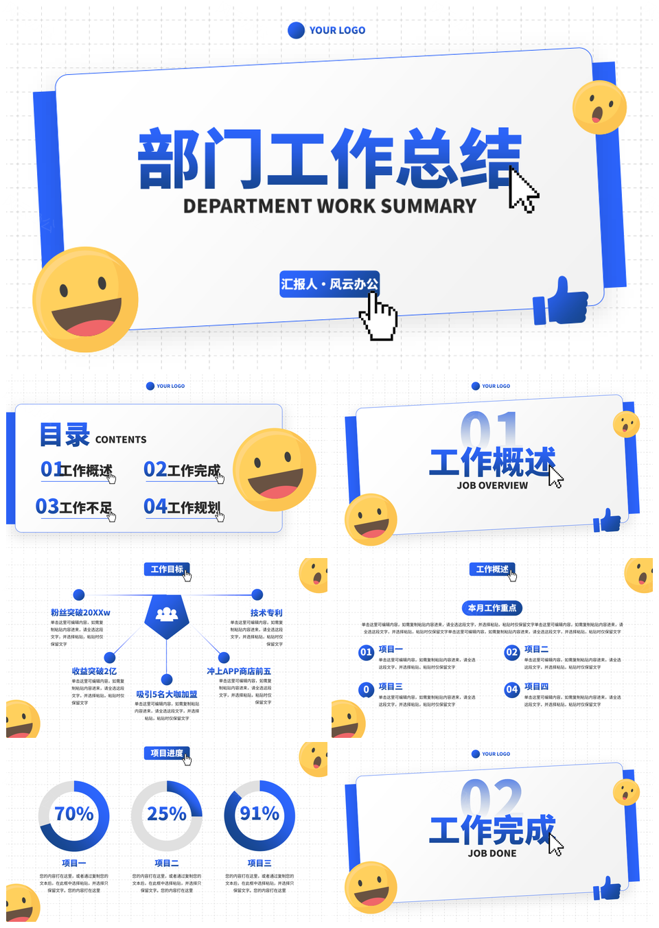 风云办公提供的蓝色高级现代部门工作汇报总结PPT模板,下载格式为pptx,一共17页,作品中文字及图均可以修改和编辑,图片更改请在作品中右键图片并更换,文字修改请直接点击文字进行修改。