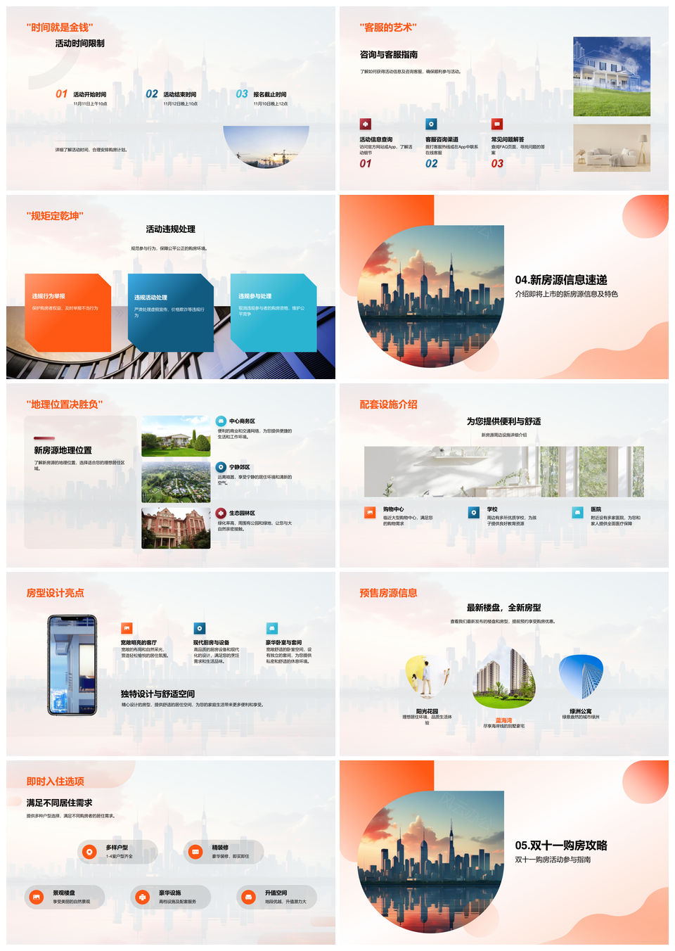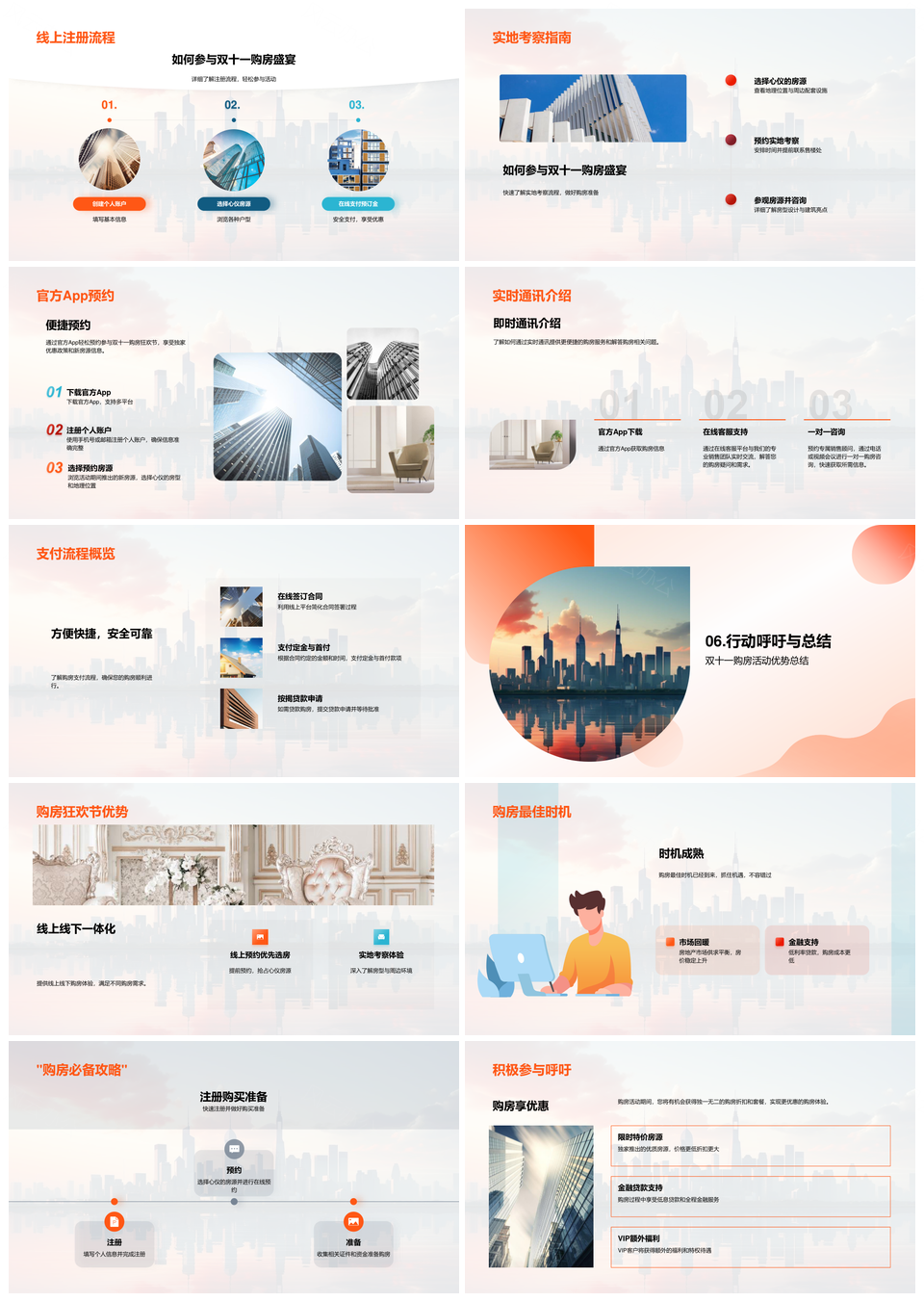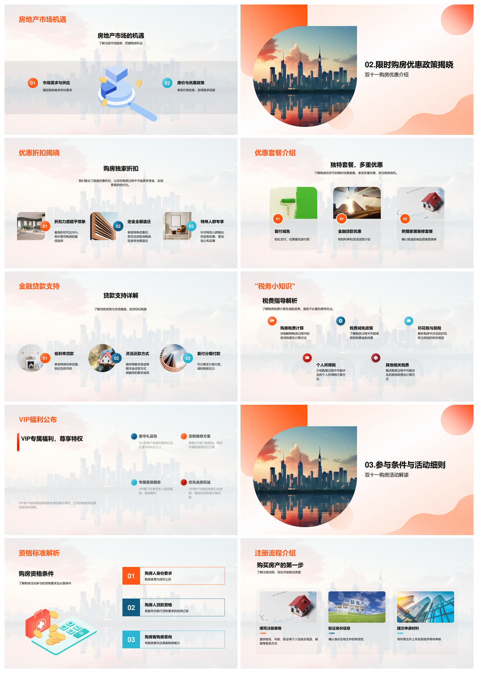 风云办公提供的双十一购房精英会楼市优惠新房攻略PPT模板,下载格式为pptx,一共39页,作品中文字及图均可以修改和编辑,图片更改请在作品中右键图片并更换,文字修改请直接点击文字进行修改。