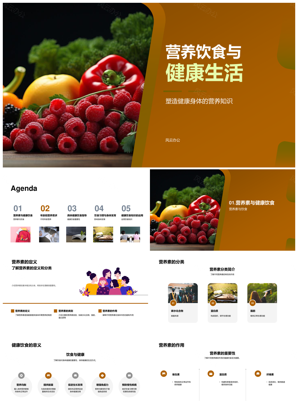 风云办公提供的全龄营养饮食健康生活果蔬指南PPT模板,下载格式为pptx,一共33页,作品中文字及图均可以修改和编辑,图片更改请在作品中右键图片并更换,文字修改请直接点击文字进行修改。