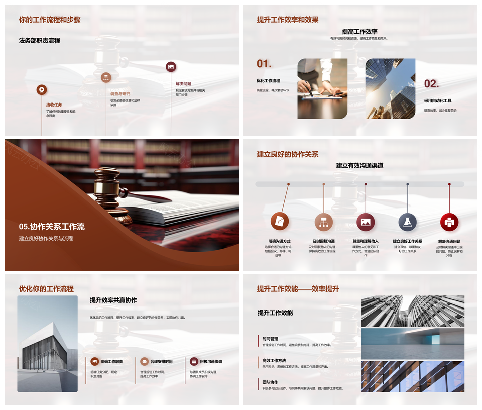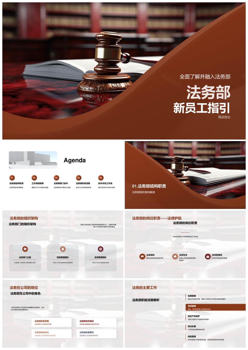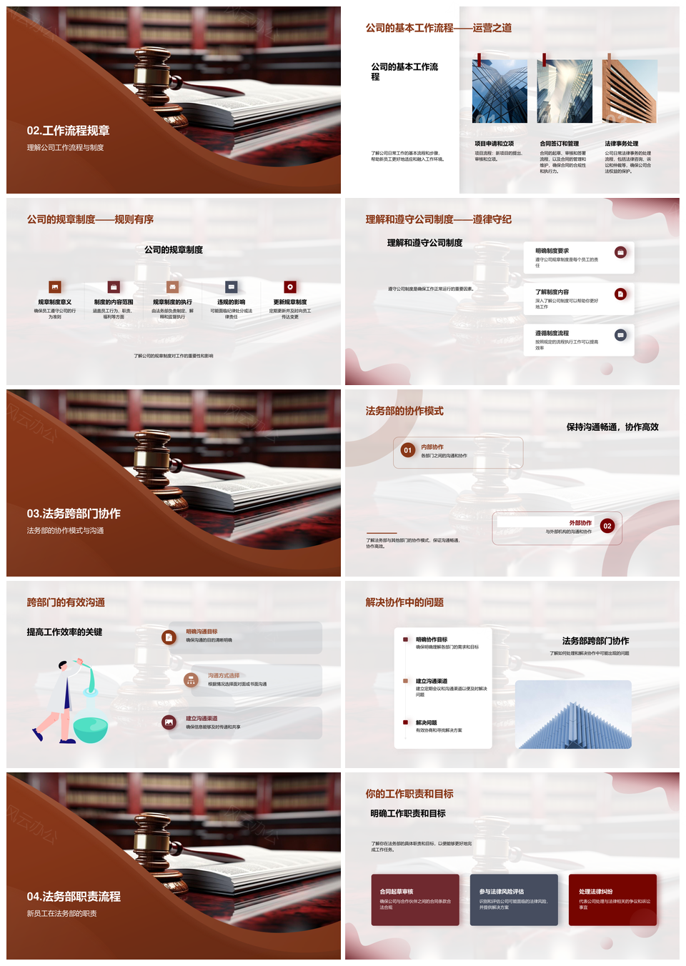 这是一张法务部新员工指引公司制度跨部门职责协作法槌PPT模板,包含法务部、新员工、指引、公司、制度、跨部门、职责、协作、法槌等主题内容,也可用作法务部新员工指引公司制度、公司制度跨部门职责协作、跨部门职责协作法槌、新员工指引公司制度、公司制度跨部门职责、跨部门职责协作、职责协作法槌、法务部新员工、新员工指引、指引公司制度、公司制度跨部门、跨部门职责、职责协作、协作法槌、法务部新员工指引等PPT场景使用。 风云办公提供的法务部新员工指引公司制度跨部门职责协作法槌PPT模板,下载格式为pptx,一共24页,作品中文字及图均可以修改和编辑,图片更改请在作品中右键图片并更换,文字修改请直接点击文字进行修改。