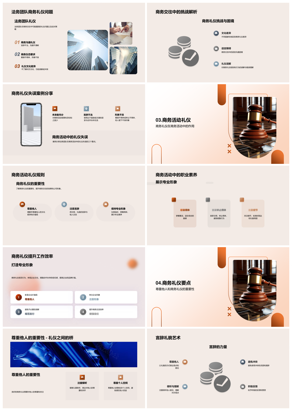 风云办公提供的法务职业素养商务礼仪法槌尊重培训PPT模板,下载格式为pptx,一共23页,作品中文字及图均可以修改和编辑,图片更改请在作品中右键图片并更换,文字修改请直接点击文字进行修改。