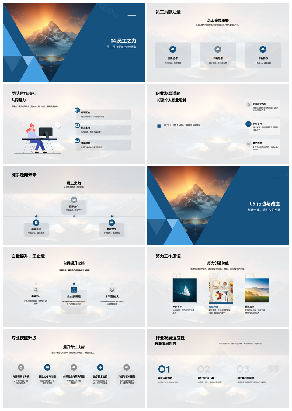 这款模板以深邃蓝色渐变为主色调,理性商务感与现代美学自然融合。模块布局采用简约设计,通过几何留白与直线切割实现视觉平衡,科技主题由波粒二象性抽象纹理与激光光束动态图形点睛。所有图标均为极简风格矢量设计,涵盖粒子轨迹、数据波动等科技可视化元素。每个版面的图文排版遵循黄金比例,保障信息展示的清晰度与阅读效率。内置的六套过渡动效均为商务场景优化,包含矩阵重组、光点聚合等抽象演绎方式。整版设计哲学兼顾专业深度与现代演示需求,适用于商业计划书、技术方案汇报等需要强化专业形象的场景。