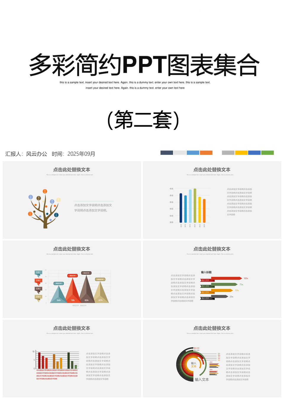 风云办公提供的2025多彩简约ppt模板图表集合PPT模板,下载格式为pptx,一共25页,作品中文字及图均可以修改和编辑,图片更改请在作品中右键图片并更换,文字修改请直接点击文字进行修改。