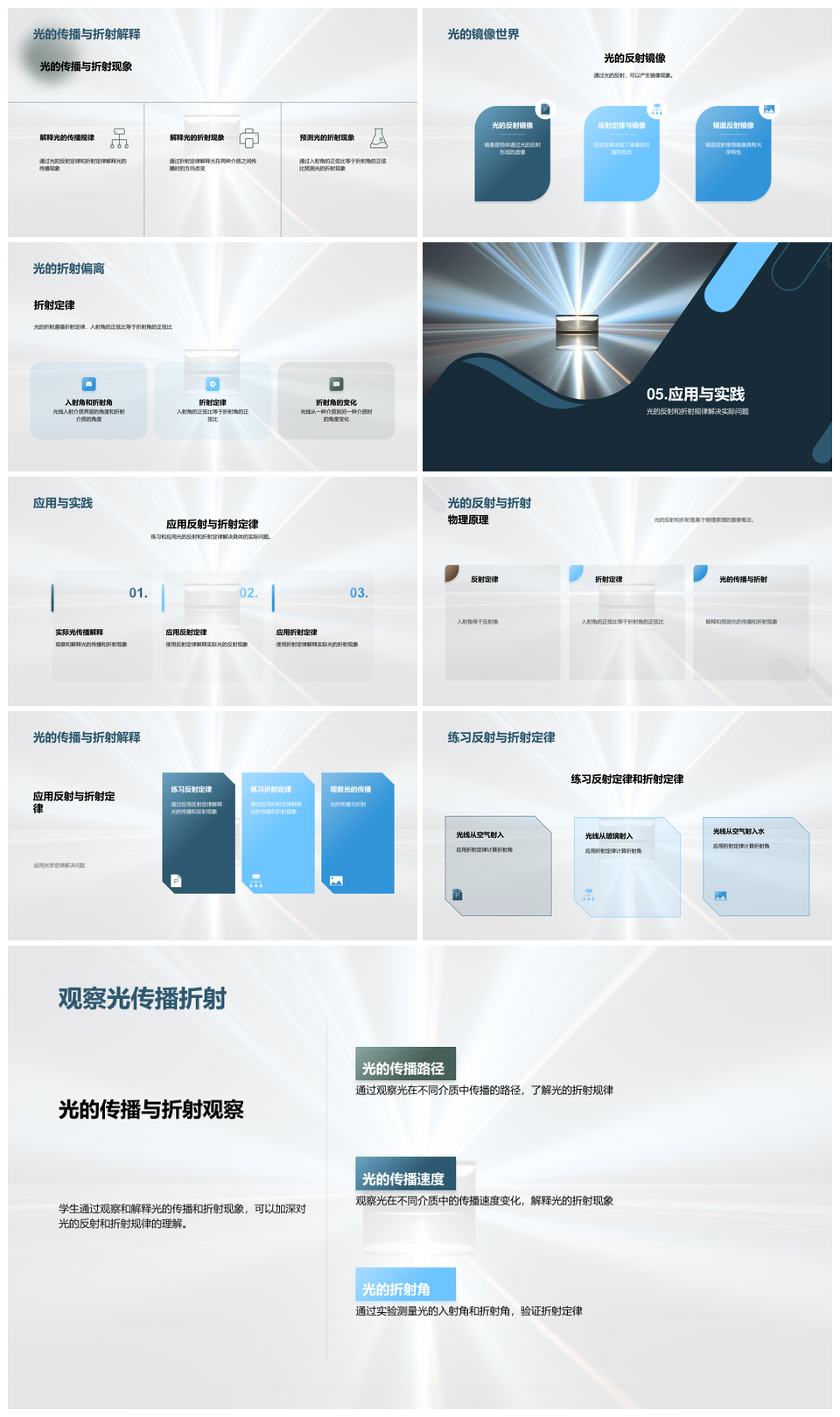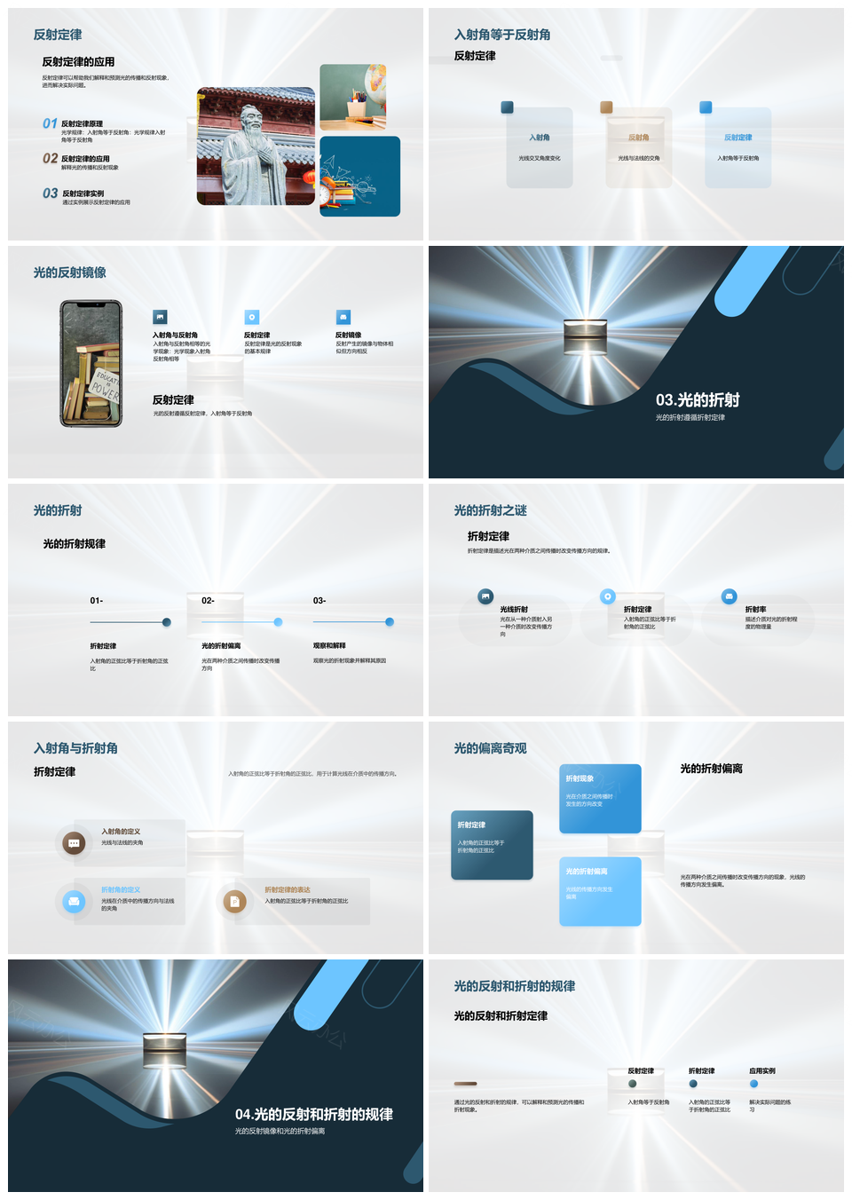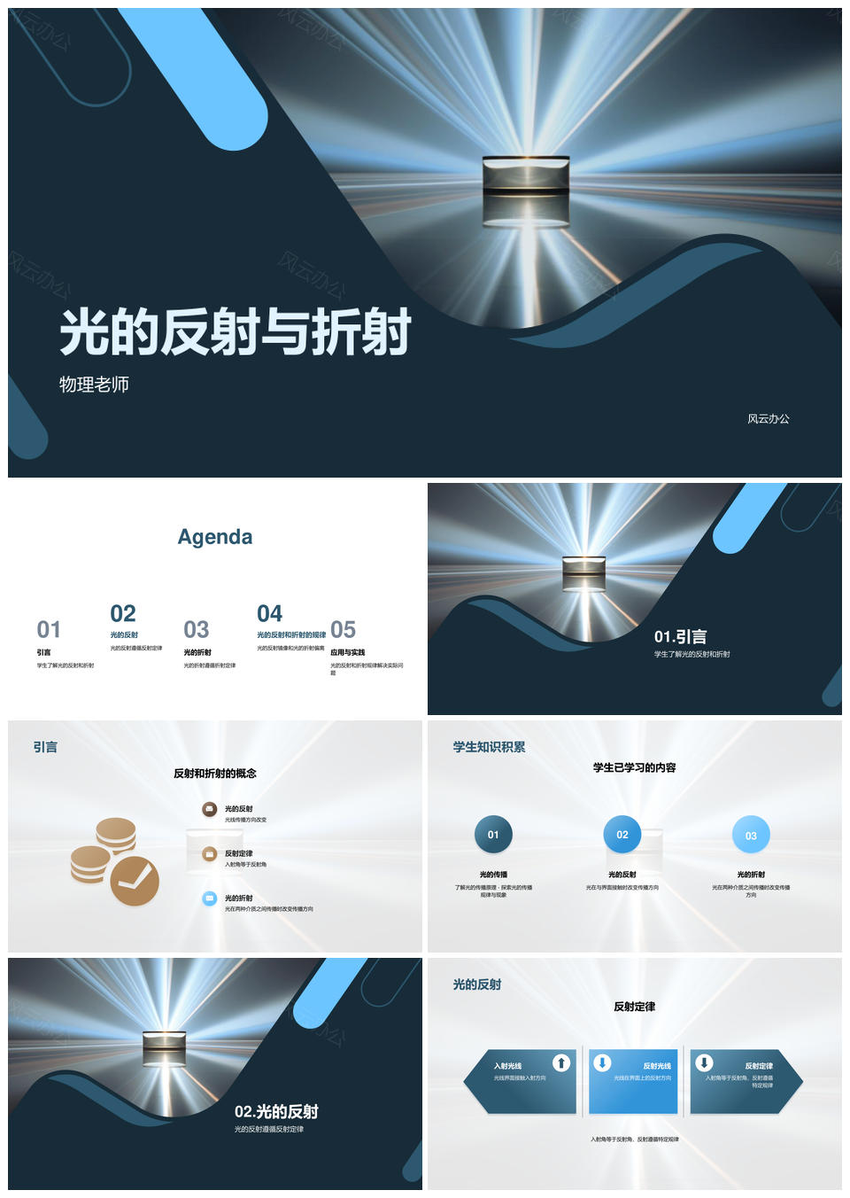 这是一张光的反射折射定律原理与应用PPT模板,包含光的、反射、折射、定律、原理、应用等主题内容,也可用作反射折射定律原理、折射定律原理应用、反射折射定律、折射定律原理、定律原理应用、反射折射、折射定律、定律原理、原理应用、反射定律、折射原理、定律应用、反射原理、折射应用、原理应用等PPT场景使用。 风云办公提供的光的反射折射定律原理与应用PPT模板,下载格式为pptx,一共27页,作品中文字及图均可以修改和编辑,图片更改请在作品中右键图片并更换,文字修改请直接点击文字进行修改。