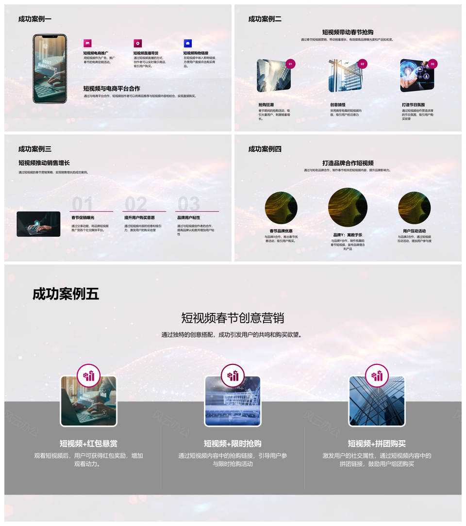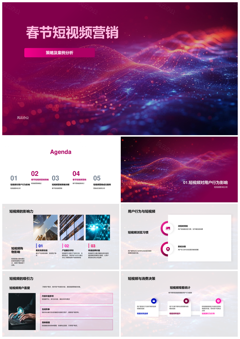 风云办公提供的春节短视频营销策略品牌合作消费决策PPT模板,下载格式为pptx,一共33页,作品中文字及图均可以修改和编辑,图片更改请在作品中右键图片并更换,文字修改请直接点击文字进行修改。